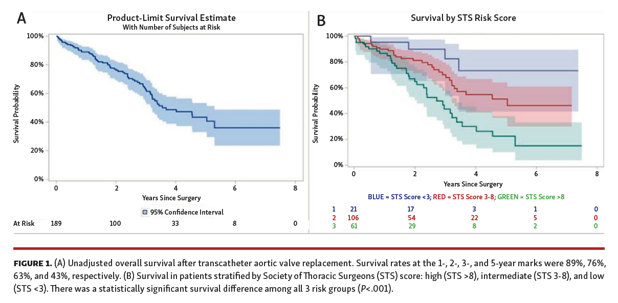 Our results also compare favorably with the most current real-world registry data. In their 2016 annual TVT registry report, Glover and colleagues reported reductions in in-hospital and 1-year mortality between 2012 and 2014 (from 5.7% to 2.9% and from 26% to 22%, respectively).30 The most recent TVT registry annual report described 1-year all-cause mortality of 13.9% in a 2017 cohort with a median STS score of 5.1. Moreover, our survival rates are on par with those found in a large meta-analysis of 31 non-randomized TAVR studies with a total of 13,857 patients with at least 5 years of follow-up, in which survival rates at 1, 2, 3, and 5 years were 83%, 75%, 65%, and 48% vs 89%, 76%, 63%, and 43% in the present analysis, respectively.31