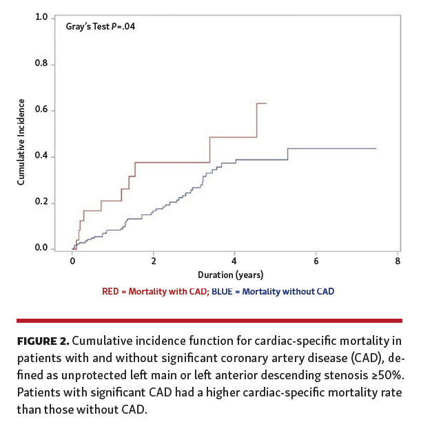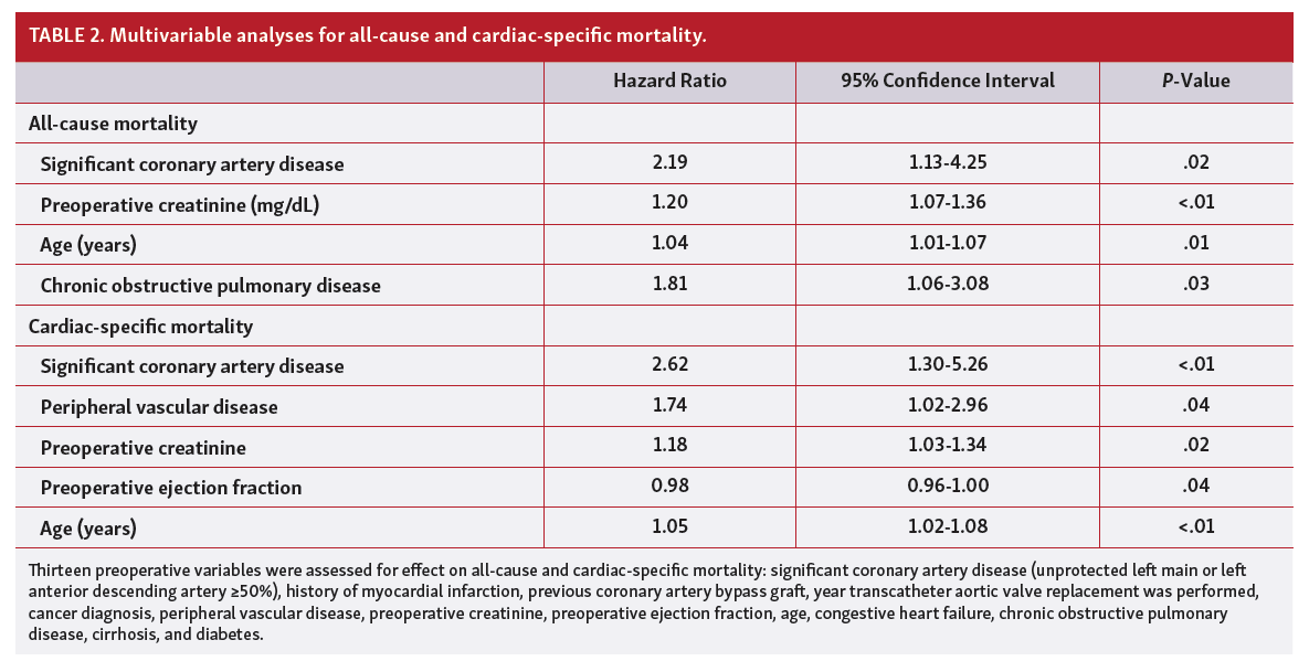 Four factors were independently associated with all-cause mortality: age (hazard ratio [HR], 1.04; 95% CI, 1.01-1.07), baseline creatinine (HR, 1.2; 95% CI, 1.07-1.36), COPD (HR, 1.81; 95% CI, 1.06-3.08), and significant CAD (HR, 2.19; 95% CI, 1.13-4.25) (Table 2). Fine-gray competing risk analysis revealed 5 independent predictors of cardiac-related mortality: age (HR, 1.05; 95% CI, 1.02-1.08), preoperative creatinine level (HR, 1.18; 95% CI, 1.03-1.34), peripheral vascular disease (HR, 1.74; 95% CI, 1.02-2.96), reduced baseline ejection fraction (HR, 1.02; 95% CI, 1.00-1.04), and significant CAD (HR, 2.62; 95% CI, 1.3-5.26) (Table 2 and Figure 2).The addition of severe stenosis of the left circumflex or the right coronary arteries to our definition of “significant CAD” had no additional effect on post-TAVR survival.