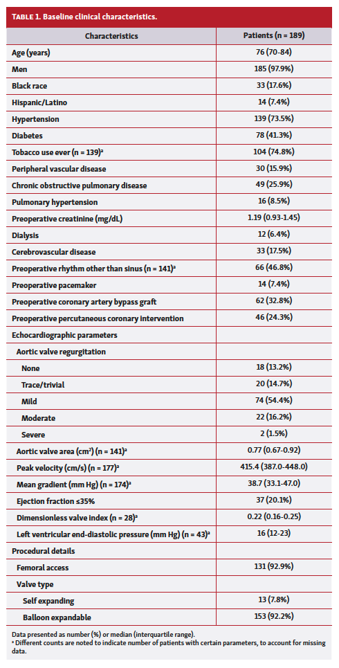 Patient characteristics. A total of 189 consecutive patients (mean age, 76.6 ± 8.4 years; 98% men) with severe AS underwent TAVR from December 2011 through May 2019. Patients’ demographic information, clinical comorbidities, and operative details are summarized in Table 1. The patients’ median STS score was 6.0 (interquartile range [IQR], 4.0-8.5). One-third of patients had prior CABG, and one-quarter had previous PCI. The mean follow-up time was 3.28 ± 0.17 years, with a maximum follow-up of 7.5 years. A balloon-expandable valve (Edwards Lifesciences) was used in 92% of patients, and the femoral artery approach was used in 93% .