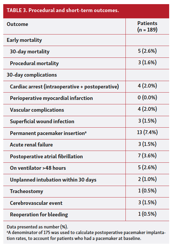 Procedural outcomes and postoperative complications. Postoperative complications for the entire cohort are listed in Table 3. Three patients had a cerebrovascular accident, 13 patients had a conduction disturbance requiring permanent pacemaker implantation, and 2 patients had a major vascular access-site related complication (1 iliac artery dissection and 1 retroperitoneal bleed). There were no coronary obstruction events. Unplanned use of cardiopulmonary bypass was necessary in 6 patients. Five patients were converted to open sternotomy for one of the following reasons: valve embolization into the left ventricle, valve embolization to the arch, contained aortic root rupture, mitral valve subchordal entanglement with severe mitral regurgitation, and ventricular septal defect.