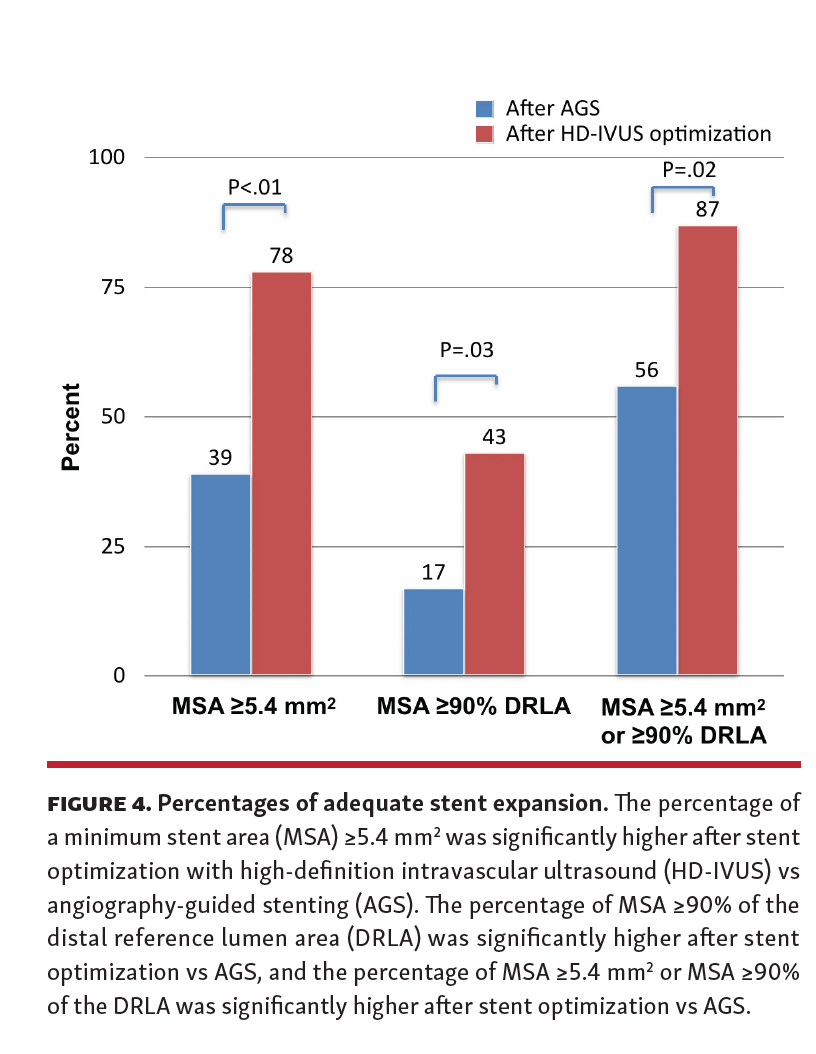 The main findings of this study are summarized as follows: (1) after stent deployment and postdilation, stent results were suboptimal in the majority of patients; (2) MSA and SVI were significantly larger after stent optimization vs AGS; (3) adequate stent expansion, defined as MSA ≥5.4 mm2 or ≥90% of DRLA, was significantly higher post HD-IVUS optimization vs post AGS; and (4) optimal stent deployment, defined as a composite of adequate stent expansion, no malapposition, PB <50% at the stent edges, and no edge dissection, was markedly higher post stent optimization vs post AGS.