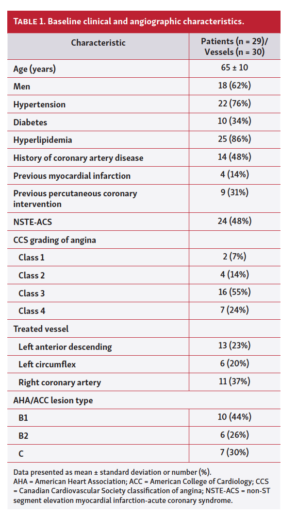 Baseline patient characteristics. Clinical and angiographic characteristics of all patients are displayed in Table 1. The majority of lesions were American Heart Association/American College of Cardiology lesion types B1 and B2.