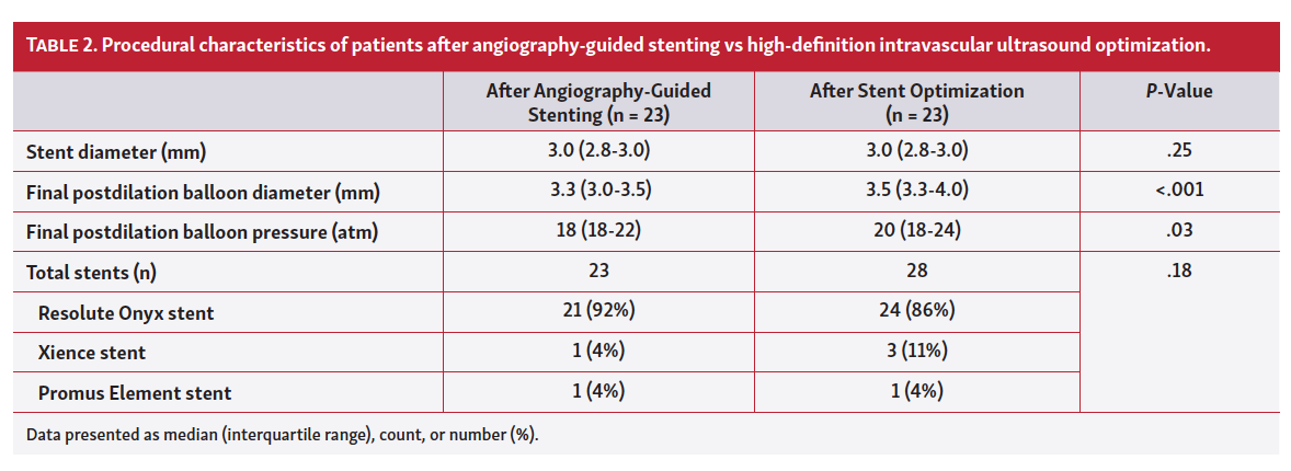 Procedural characteristics. The procedural characteristics of patients are shown in Table 2. The final post-stent dilation balloon diameter was significantly larger after HD-IVUS optimization vs AGS. The final post-stent balloon inflation pressure was significantly higher after HD-IVUS optimization vs AGS. After HD-IVUS optimizations, 5 additional stents were deployed for PB >50% or edge dissection.