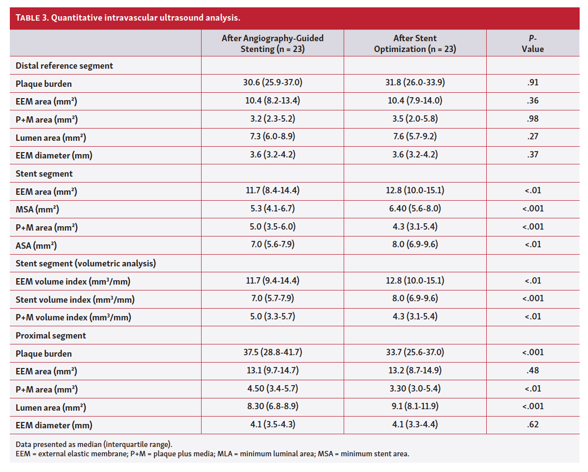 Statistical analysis. This was an exploratory study to investigate the feasibility of the stent optimization strategy with the HD-IVUS system. Since there are no published data, the sample size of the study was arbitrarily determined. Based on the Shapiro-Wilk test, clinical characteristics and IVUS data were not normally distributed. Therefore, the above data were compared before and after optimization using the Wilcoxon signed-rank test and are presented as median (interquartile range [IQR]). The QCA data were compared using the Friedman test and significance was determined after multiple pairwise comparisons with the Dunn’s post test. QCA data are reported as median (IQR). Categorical variables were compared using the McNamara’s test. P-value <.05 was considered statistically significant. Statistical analysis was performed with SPSS, version 24 (IBM) and MedCalc, version 17.6 (MedCalc).