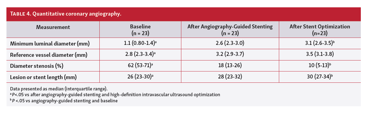 Quantitative coronary angiography (QCA). QCA was performed offline at baseline, post angiography-guided stenting, and post HD-IVUS optimization using validated commercially available edge-detection software (QCACMS, version 5.2; Medis Medical Imaging Systems), as previously described.13