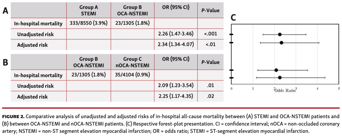 Primary endpoint. Overall, there were 391 IH deaths (2.8%). Unadjusted IH all-cause mortality was higher in the STEMI cohort in comparison with the OCA-NSTEMI group (OR, 2.26; 95% CI, 1.47-3.46; P<.001) and higher in the OCA-NSTEMI cohort than in the nOCA-NSTEMI cohort (OR, 2.09; 95% CI, 1.23-3.54; P<.01). After adjustment for known confounders, the primary endpoint rates remained higher among STEMI patients when compared with OCA-NSTEMI patients (OR, 2.34; 95% CI, 1.34-4.07; P<.01) and higher in the OCA-NSTEMI cohort than in the nOCA-NSTEMI group (OR, 2.25; 95% CI, 1.17-4.35; P=.02) (Figure 2).