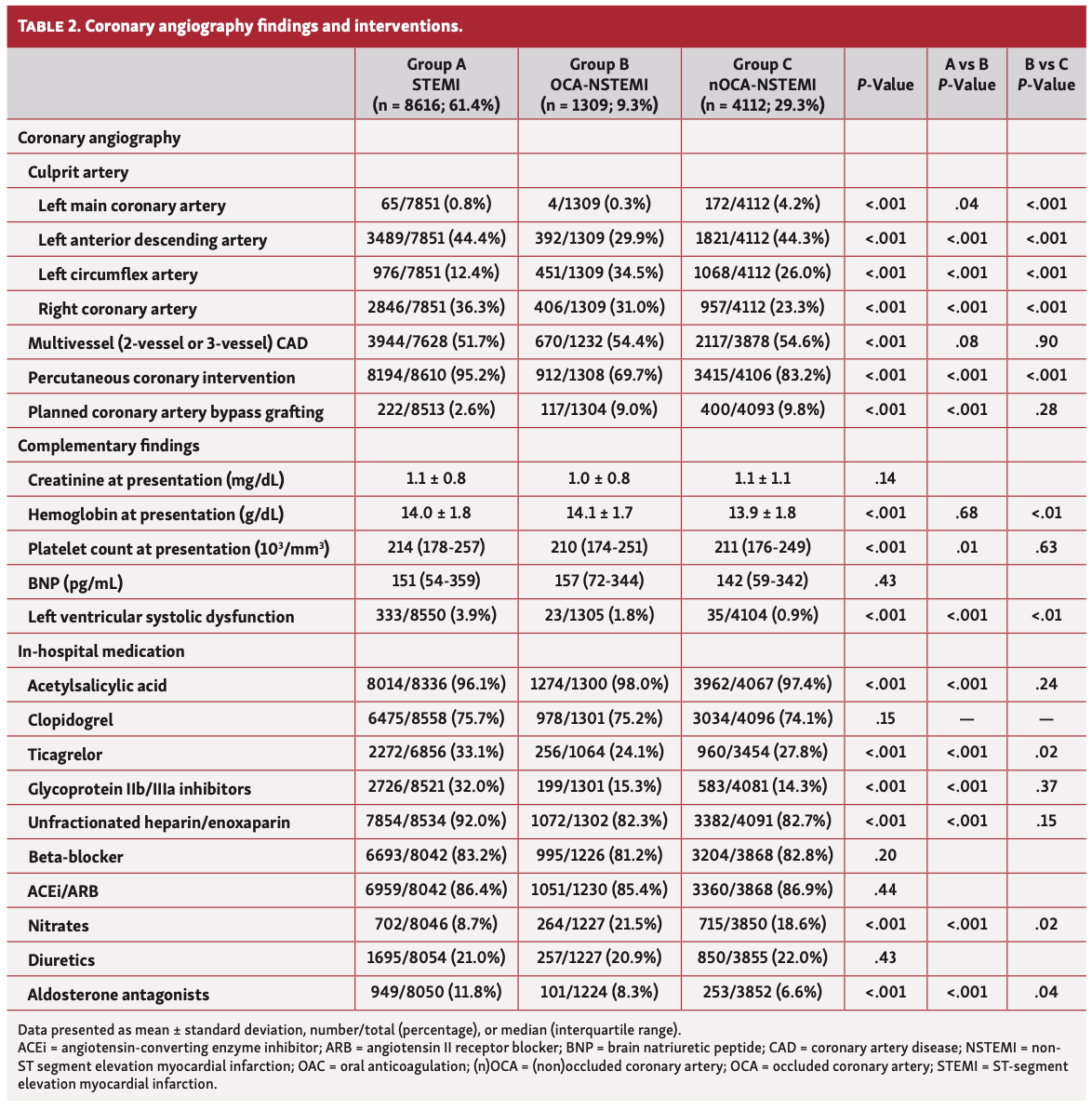 Coronary angiography findings and interventions (Table 2). The incidence of multivessel CAD did not differ in both paired comparisons. An OCA was found in 24.1% of the patients presenting with NSTEMI (n = 1309/5421). Regarding culprit artery distribution, the LCX was more frequently involved in group B than in groups A and C (12.4% A vs 34.5% B [P<.001] and 34.5% B vs 26.0% C; [P<.001]), the left anterior descending artery (LAD) was the culprit most frequently in groups A and C compared with group B (44.4% A vs 29.9% B [P<.001] and 29.9% B vs 44.3% C [P<.001]), and the right coronary artery more frequently in group A and less frequently in group C compared with group B (36.3% A vs 31.0% B [P<.001] and 31.0% B vs 23.3% C [P<.001]). PCI was less likely to be performed in group B compared with both groups A and C (95.2% A vs 69.7% B [P<.001] and 69.7% B vs 83.2% C [P<.001]), while CABG was equally performed in groups B and C. Group B presented lower incidence of LVSD than group A (19.9% A vs 12.2% B; P<.001) and higher incidence than group C (12.2% B vs 8.1% C; P<.001).