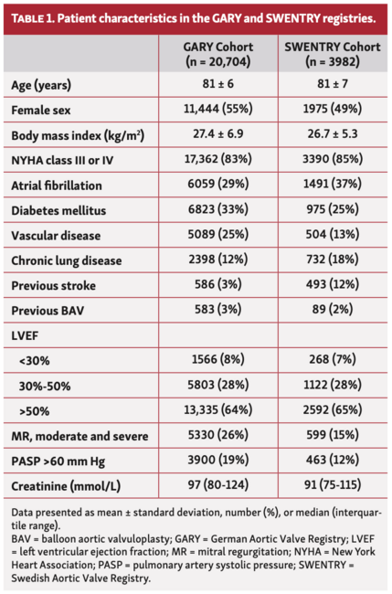 Data sources. Patients included in GARY were used as the derivation cohort and the validation was performed on patients from SWENTRY. Both are all-comer registries collecting data on all TAVR procedures performed in Germany and Sweden, respectively. GARY is a nationwide registry of patients with aortic valve treatment19 and its design has been described previously.3,21,22 Data from 92 hospitals performing aortic valve interventions and/or surgical aortic valve replacements are collected using standardized case report forms to record demographic, clinical, procedural, and follow-up data. The design of SWENTRY has also been described previously.23 Data from 8 Swedish TAVR centers are collected into an electronic database platform, after patient consent and heart team evaluation. Record linkage through the National Civil Registry ensured full data capture for mortality.