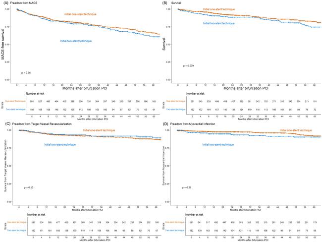 Categorical variables were presented as percentages and compared using Pearson’s chi-square test. Continuous variables were described as mean ± SD for normally distributed data or median with IQR for non-normally distributed data. Normally distributed data were analyzed using the independent-sample t-test; non-parametric data were analyzed using the Mann-Whitney U-test. Univariable logistic regression analysis was initially used to evaluate the effect of different stenting strategies on bifurcation PCI for technical success and periprocedural or in-hospital MACE. Variables found to be associated with outcomes at a significance level of P less than 0.10 were included in the multivariable models. Kaplan-Meier survival analysis was used to calculate the incidence of follow-up events, which were compared using the log-rank test and mixed effects Cox proportional hazard ratios (HR). All statistical analyses were performed using R Statistical Software, version 4.4.0 (R Foundation for Statistical Computing). A P-value of less than 0.05 was considered statistically significant.