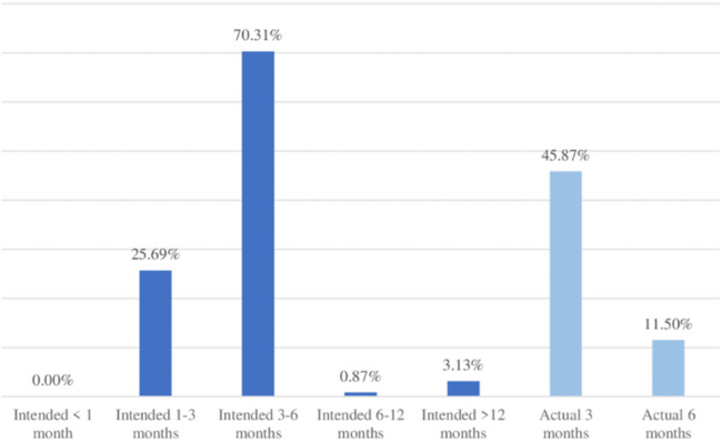 Clinical, paraclinical, and procedural characteristics of each group are reported in Table 2. More patients in the TT group presented with a Killip 3 or 4 MI (20.33% vs 10.95%, respectively; ASD=0.26). Patients underwent an echocardiographic evaluation of LV function at a mean of 6 days following the index event. Mean LV ejection fraction was lower in the TT group than in the DAPT (35.48 ± 8.46% vs 43.55 ± 10.16%; ASD=0.86). Patients in the TT group were more likely to have a higher wall-motion score index (1.96 ± 0.32 vs 1.69 ± 0.35; ASD=0.82) and to have LV aneurysm on echography (5.37% vs 1.89%; ASD=0.19), but were less likely to have received a drug-eluting stent (44.37% vs 62.74%; ASD=0.37). Medication at discharge, at 3 months, and at 6 months is presented in Table 3. Patients in the TT group were more likely to be prescribed clopidogrel over more potent P2Y12 inhibitors (93.62% vs 51.40%; ASD=1.11), a protein pump inhibitor (75.40% vs 59.42%; ASD=0.35), and mineralocorticoid receptor antagonists (22.76% vs 6.56%; ASD=0.47) at discharge. The intended duration of OAC planned at discharge from the STEMI hospitalization and actual duration of OAC in the TT group is detailed in Figure 1. In the TT group, 249 patients (45.87%) were treated with OAC at 3 months and 59 patients (11.50%) were treated with OAC at 6 months.