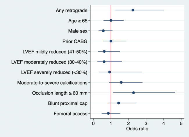 In the present study, the risk of in-hospital MACE was higher in the RA group (10.2% vs 4.7%, P < .001). After adjustment for potential confounders, the association between the RA and MACE remained significant, with an OR of 2.25 (95% CI, 1.26-4.02). This finding is consistent with what was observed in other North American registries. In the OPEN-CTO registry, the risk of in-hospital AEs was 10.8% in the retrograde group and 3.3% in the antegrade-only group (P < .001).24 In the PROGRESS-CTO registry, the risk of complications was 5.05% in the RA group and 0.81% in the AO group (P < .001).29 In both registries, a retrograde component of the CTO PCI was an independent predictor of adverse in-hospital outcomes. As such, in the Progress Complication score, an RA is associated with a 2-point increase in the score.31