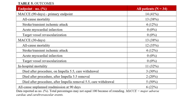 Major hemolysis occurred in 2 (6%) patients; 1 was patient-related due to a pre-existing LV thrombus, and the other was device-related. Five (16%) patients had a new requirement of dialysis during their hospitalization; 2 of these patients had recovery of their renal function prior to discharge, and 2 patients had an in-hospital mortality. One patient was initiated on dialysis a few days before Impella 5.5 placement and continued to require dialysis 90 days post-procedure. There were no reported episodes of sepsis.