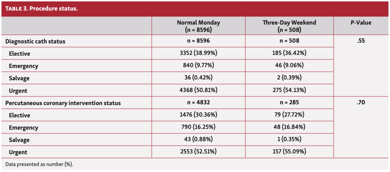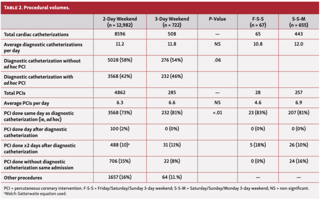 The long weekend may have several effects. First, patients with acute coronary syndrome (ACS) awaiting catheterization may have increased time to percutaneous coronary intervention (PCI) and an increased risk of mortality.1-3 Second, reductions in weekend staffing may lead to a deficit in care.4 Finally, the backlog of cases accumulating over a 3-day weekend may tax resources available on the day following the weekend. Our study evaluated the last of these possible effects. We hypothesized that after 3-day weekends, compared with 2-day weekends, procedural volumes would be higher and that this might lead to changes in practice patterns (eg, fewer ad hoc PCIs) or increased periprocedural complications if operators were stressed or hurried by a postholiday surge in catheterization laboratory procedure volume.