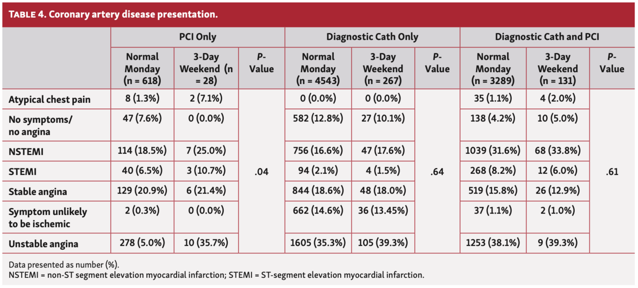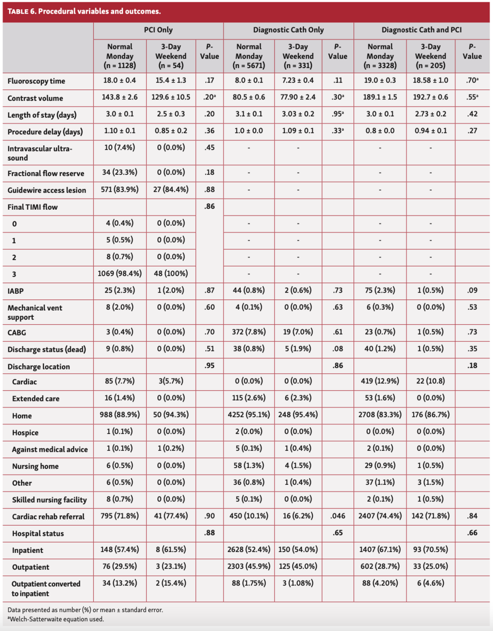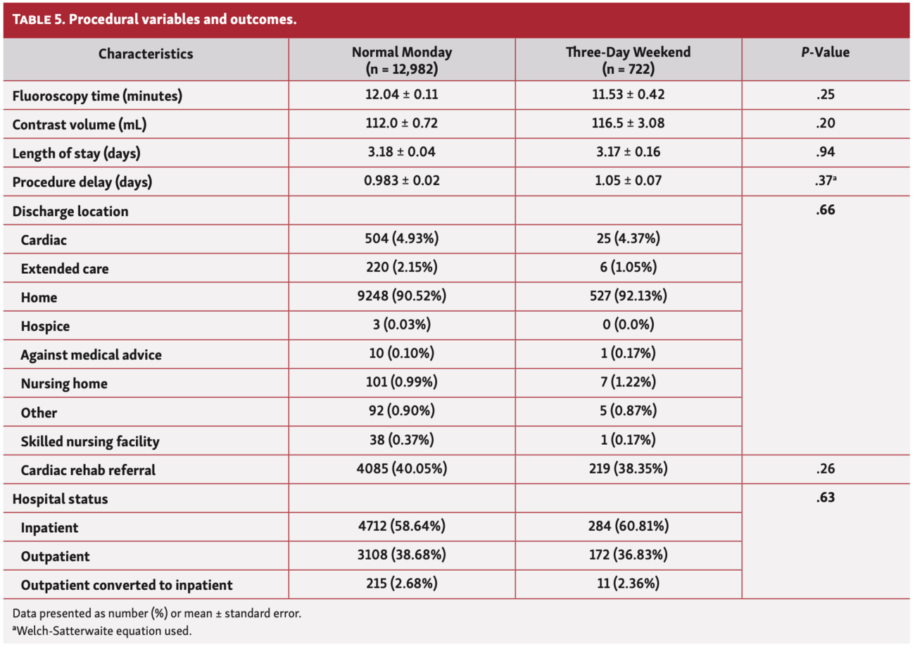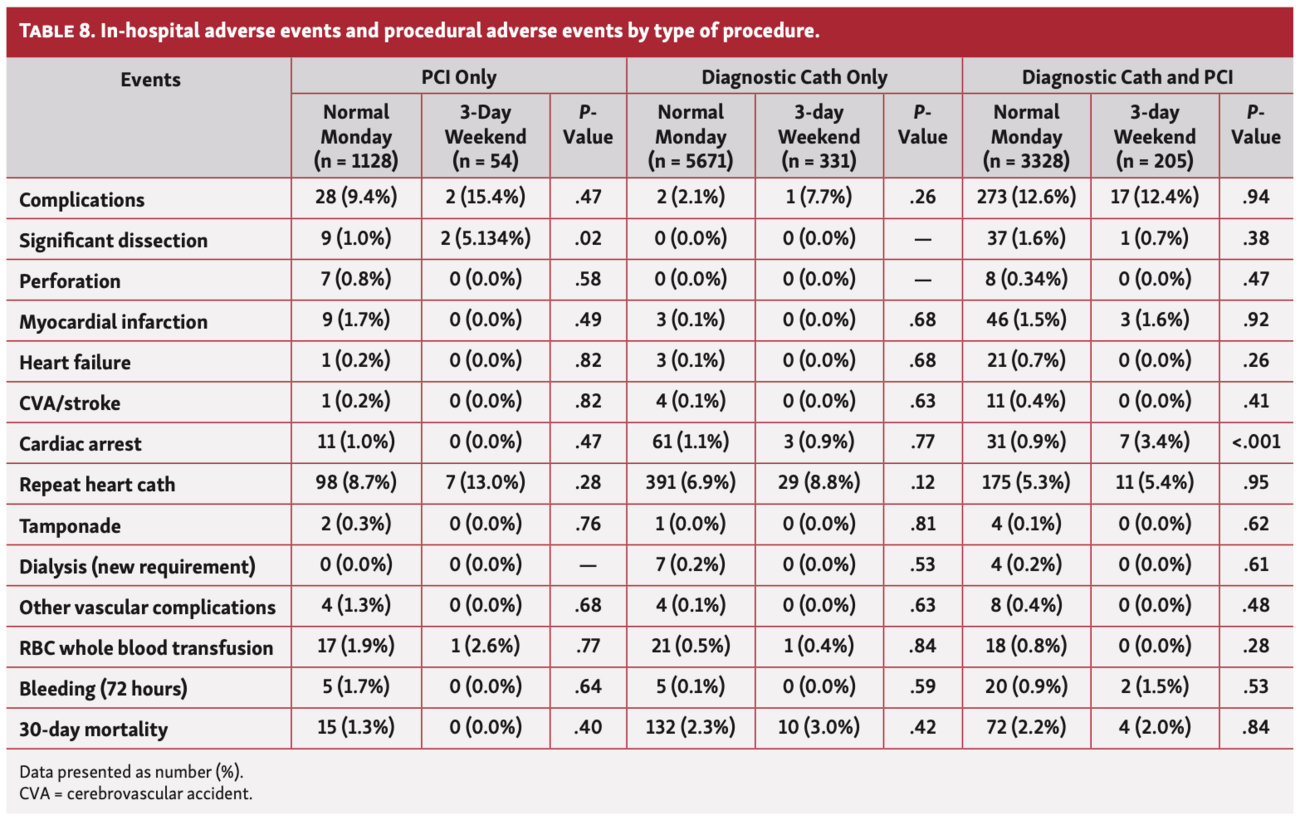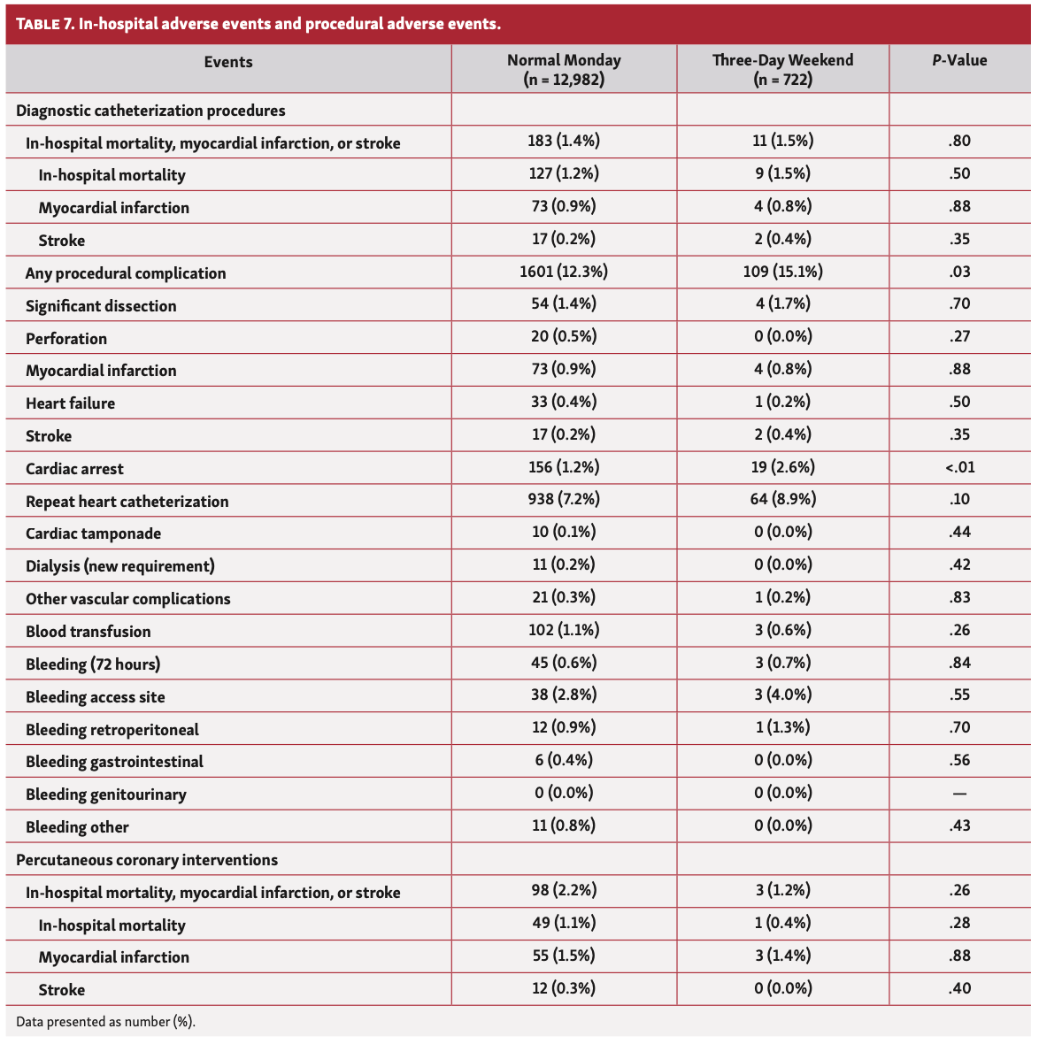 The most important finding of this study is that there was no difference in in-hospital mortality, myocardial infarction, stroke, or procedural complications in patients undergoing catheterization after a 3-day weekend vs a 2-day weekend. This contradicts our hypothesis that complications would be increased after a 3-day weekend, perhaps because the operators were hurrying to complete a busy caseload or patients were more acute.