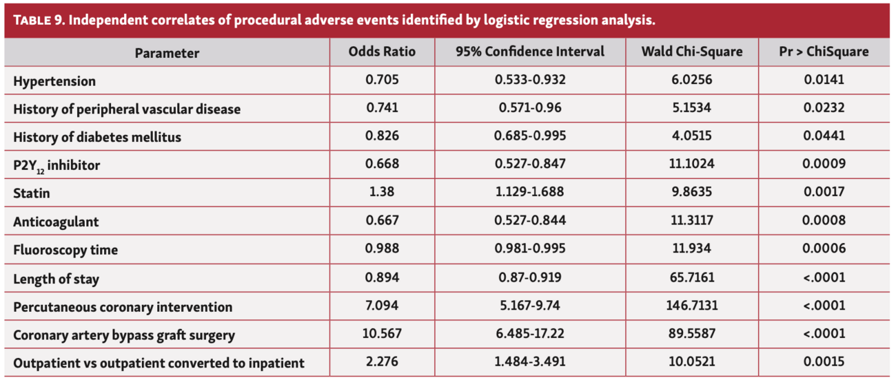 Adverse outcomes were independently associated with a history of peripheral vascular disease, diabetes mellitus, use of P2Y12 inhibitors, use of anticoagulants, fluoroscopy time, length of stay, coronary intervention (compared with diagnostic catheterization alone), CABG, and lack of preprocedural statin use, as has been demonstrated in other studies of ACS patients.