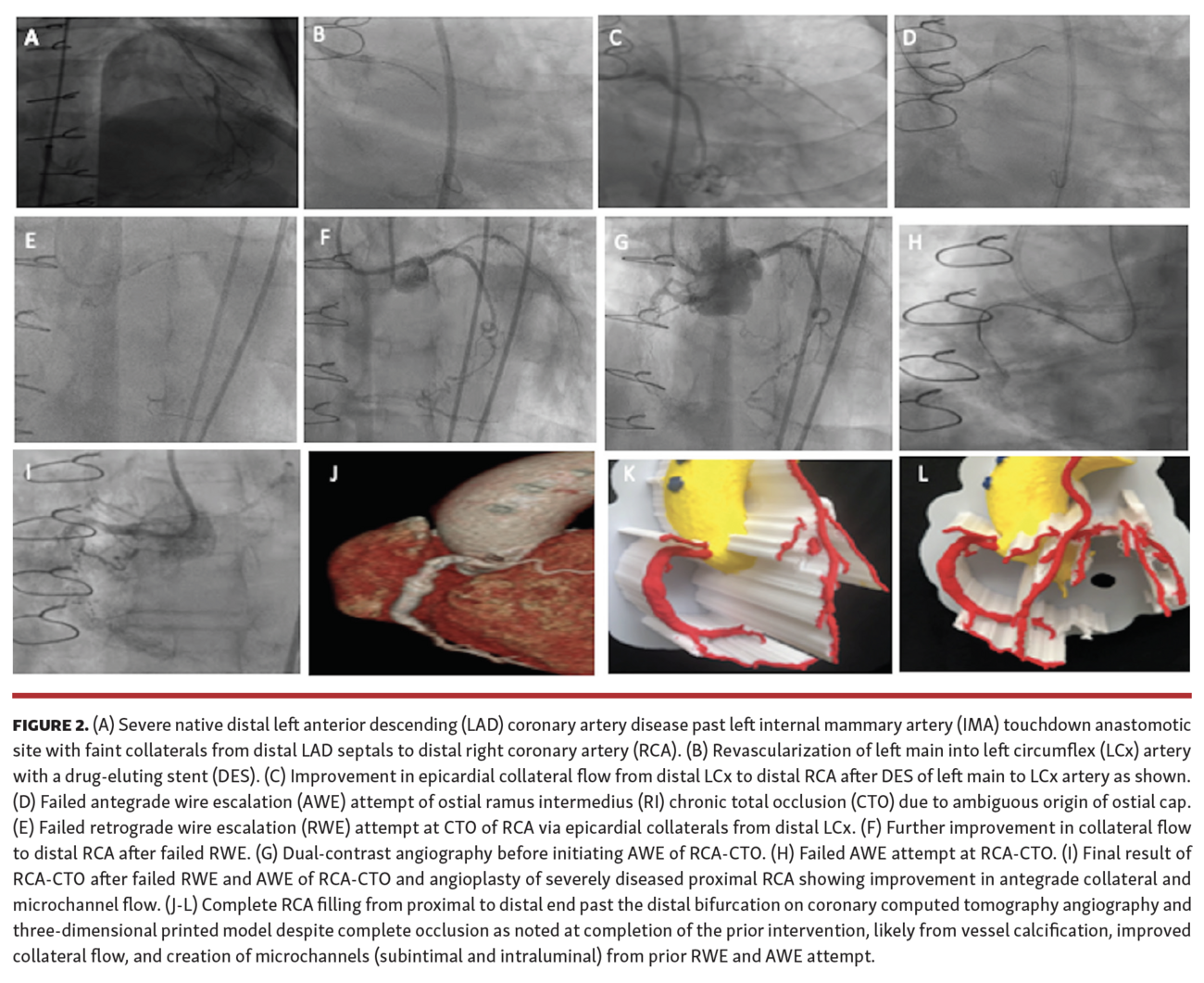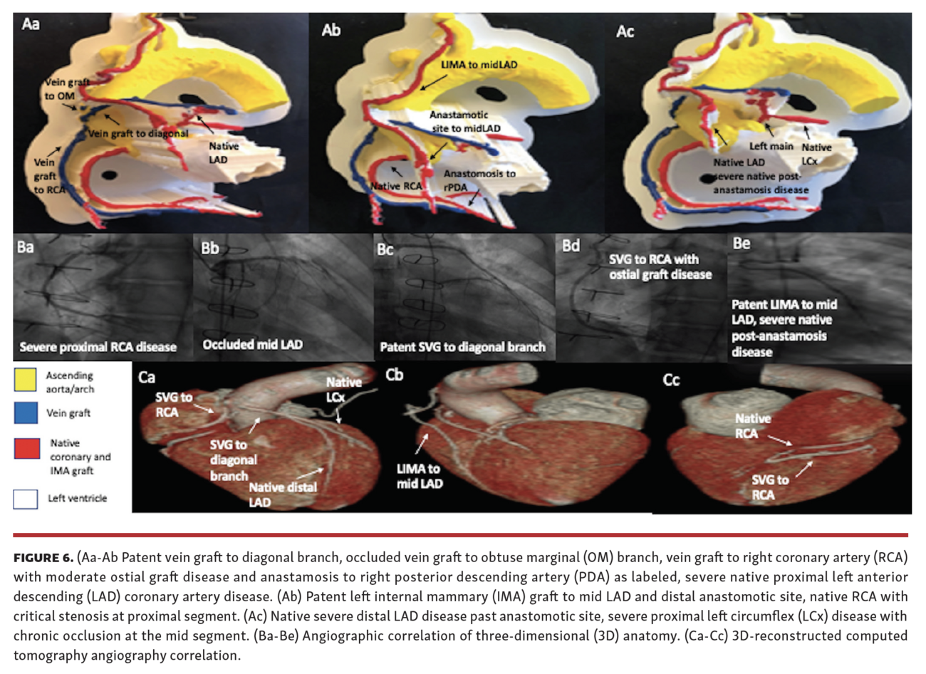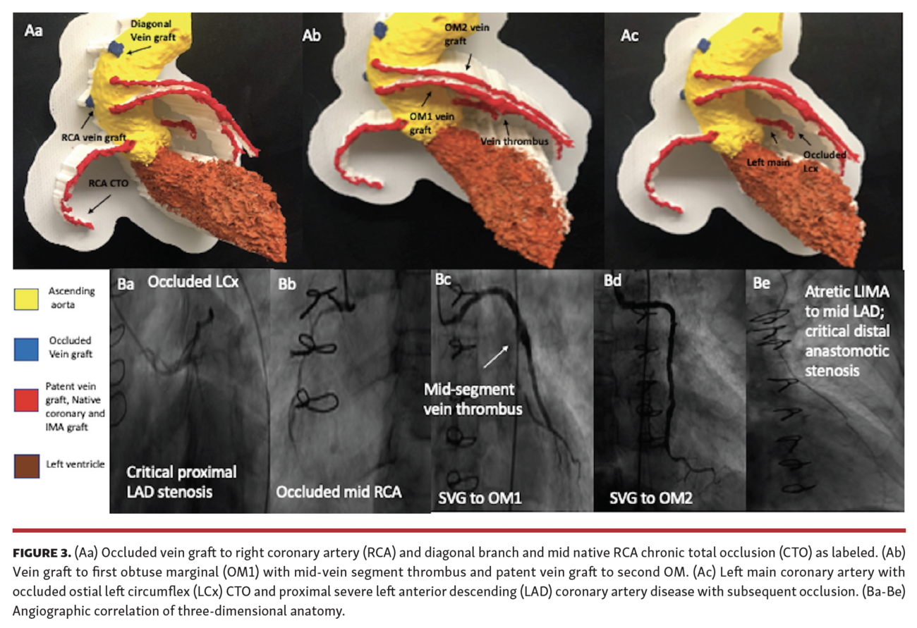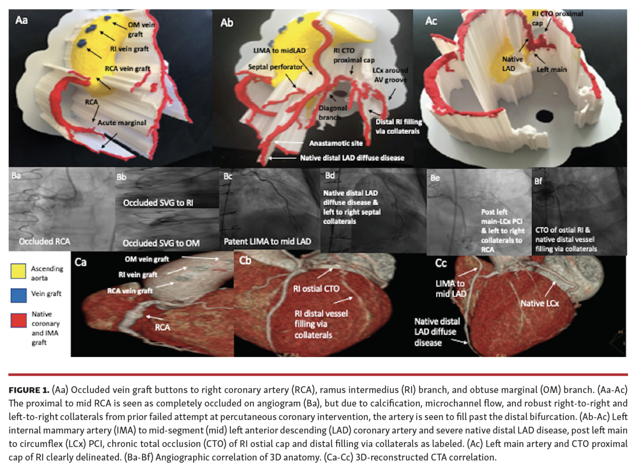 Three-dimensional (3D) printing technology has been successfully utilized within numerous medical specialties for both research and educational purposes, such as pharmaceutics for drug discovery, stem cell for tissue and organ regeneration, prosthetics and implant creation, and anatomical models for procedural planning.1 There has been, however, limited investigative effort made toward its potential in the diagnosis and treatment of coronary artery disease (CAD). Coronary artery bypass graft (CABG) surgery patients represent a complex subset, with an increased risk of procedure-related complications during diagnostic and percutaneous coronary intervention (PCI) related to requirement of multiple catheters for engagement associated with increased procedural time and contrast volume. Great vessel tortuosity can further add to procedural complexity, and these anatomical complexities translate to higher rates of procedure-related stroke. The learning curve for new operators to become confident in their diagnostic and PCI capabilities in CABG patients is also steeper due to the aforementioned factors. A coronary computed tomography angiography (CCTA) is often the next step to delineate complex anatomy in cases where a diagnostic or interventional procedure is unable to be completed safely in a timely and contrast-controlled manner from occluded or angulated origin of grafts, or ambiguous caps in PCI for chronic total occlusion (CTO). The addition of 3D-reconstructed computed tomography angiography (3D-CTA) allows further improved understanding of a two-dimensional (2D) representation of 3D anatomy. 3D-printed models (3D-PMs) can bridge the gap between a virtual image to that of a real-life model for enhanced appreciation of anatomy to guide learning and procedural planning.