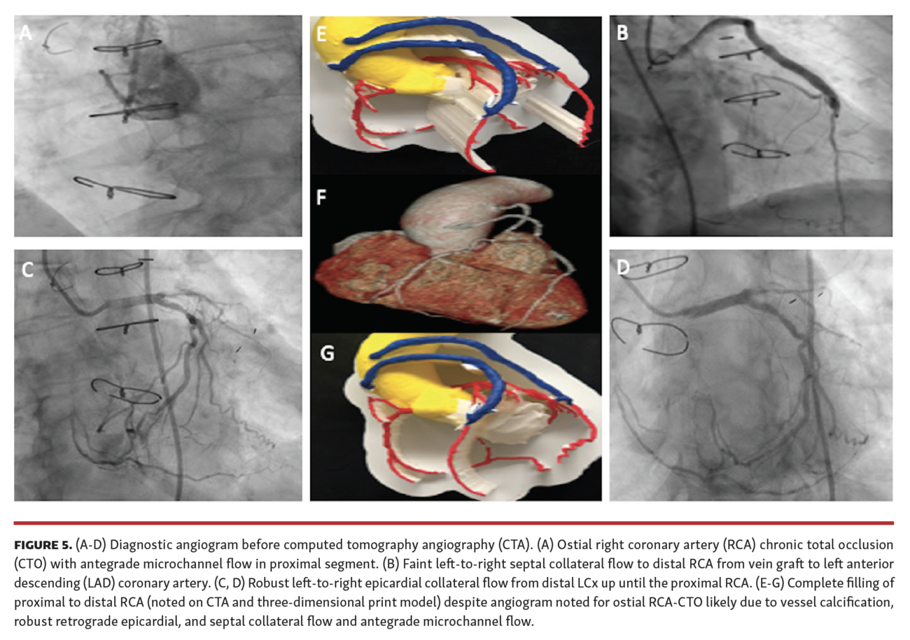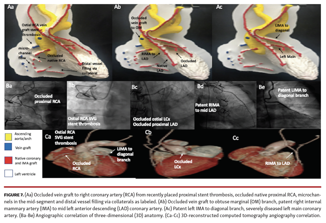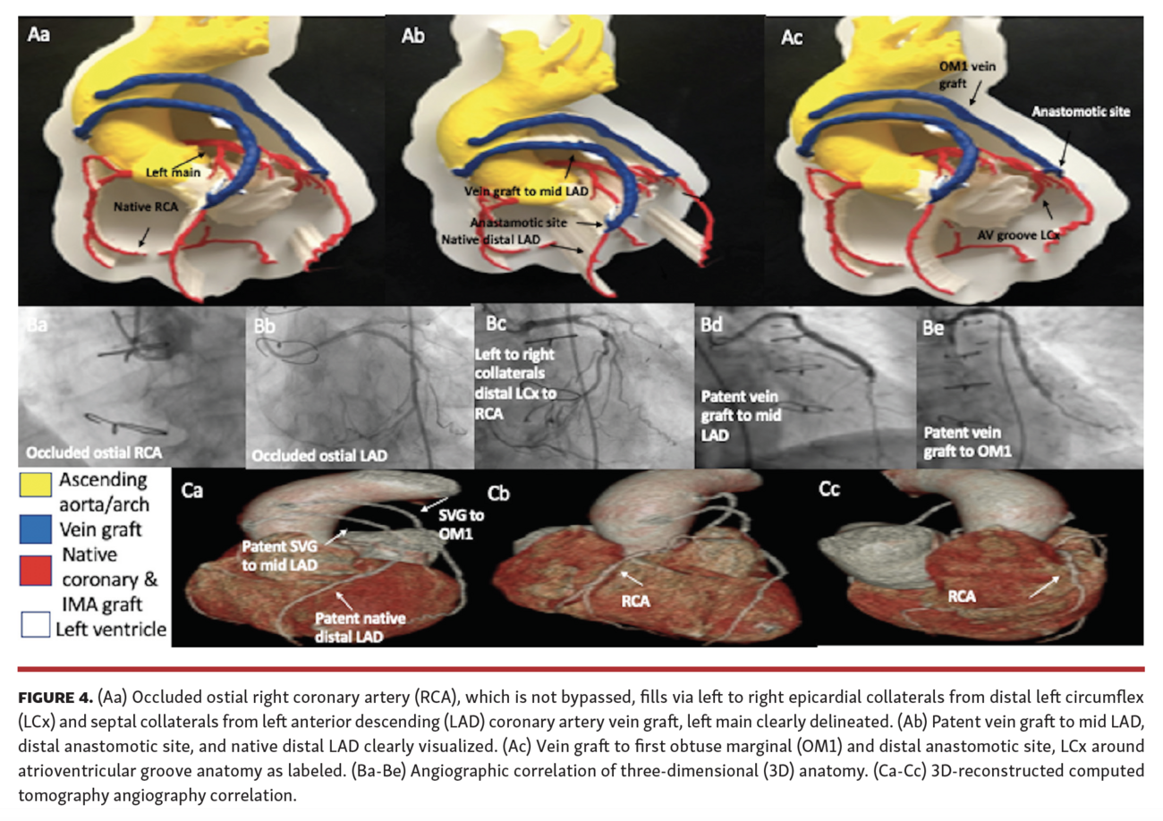 d. The native RCA, although chronically occluded at the ostium on diagnostic angiogram (4Ba, 5A), is noted to fill until the distal RCA on 3D-CTA and 3D-PM (4Aa, 4Cb-4Cc, 5E-5G). As seen in case #1, this unexpected finding is likely from native vessel calcification along with robust left-to-right epicardial collaterals from the distal LCx allowing retrograde filling to the proximal RCA (5C-5D), septal collaterals from LAD vein graft (5B), and antegrade proximal vessel microchannel filling (5A).