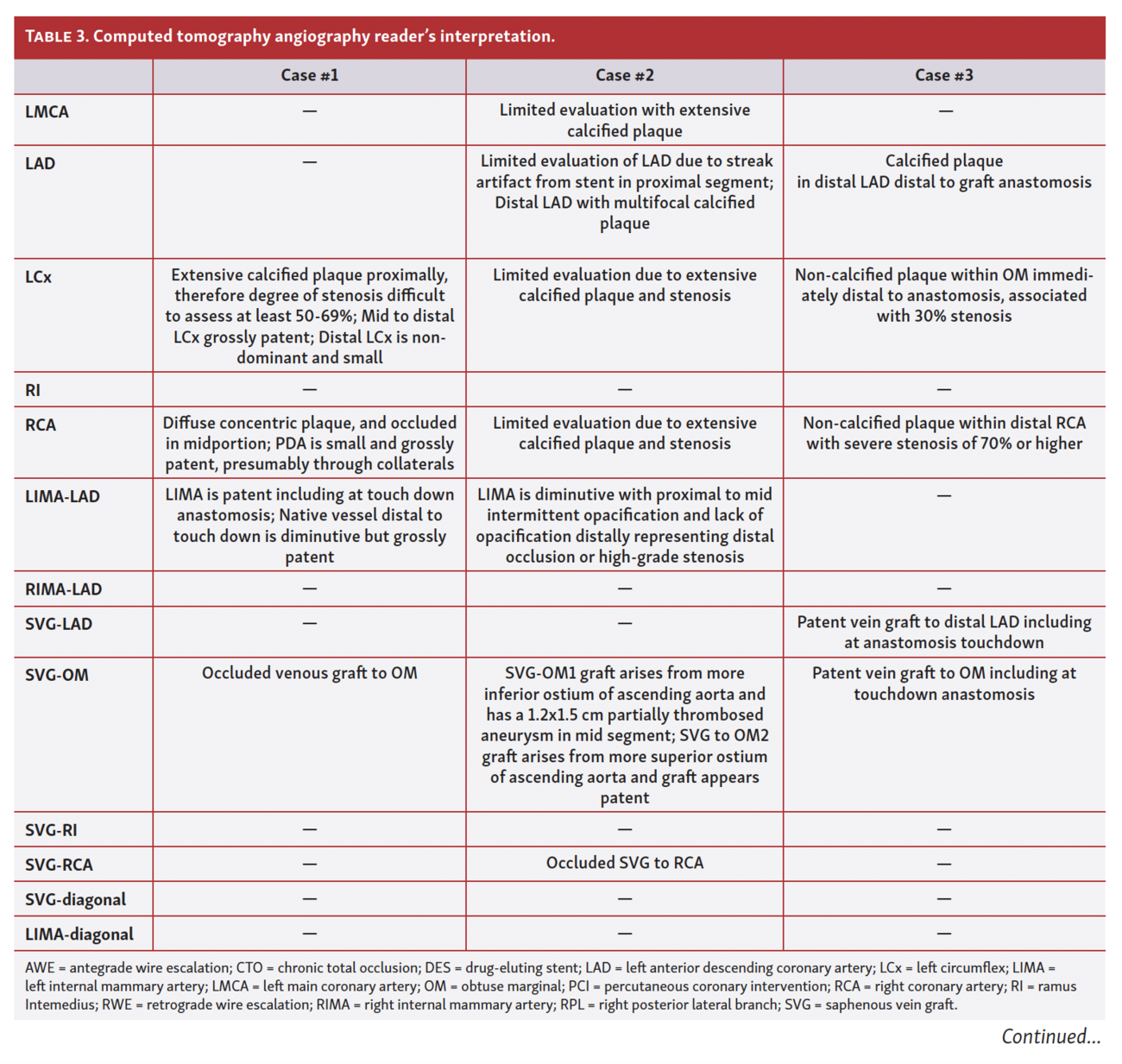 Role of imaging and benefits of 3D printing of CABG patients. The diagnostic accuracy for assessment of ≥50% stenosis in venous or arterial grafts by CTA is high, with a 100% sensitivity and specificity in one study.25 In our study, all occluded and diseased grafts were accurately printed on all five 3D-PMs. However, a known limitation of CTA is its ability to differentiate from very high-grade stenosis to that from CTO, which has been related to partial volume effect and lower spatial resolution of CTA to that of coronary angiogram.26 Hence, a confirmation with coronary angiogram is usually required when a total occlusion is interpreted on CTA. Nonetheless, CTA has the ability to identify calcification, vessel tortuosity, occlusion length, distal vessel anatomy past occlusion, and ostial CTO stumps.27 In one report, CTA had the ability to identify distal vessel and route for CTO-PCI in 68% vs 18% with use of coronary angiogram alone.28 Current published data also show that ostial CTOs are associated with longer fluoroscopy times, more frequent retrograde approach for recanalization, and lower success rates than non-ostial occlusions.29 Hence, 3D-PM could assist and perhaps tailor the hybrid algorithm in CTO involving CABG patients, as ostial CTO could be better approached than current practices30 by identification of chronic ostial cap occlusion, appreciation of proximal cap angulation, identification of tapered or blunt cap, and distal vessel course, all of which can alleviate cap ambiguity. This is illustrated in Case #1, where the operator was unable to engage the RI ostial cap by coronary angiogram alone due to ambiguity. The ostial CTO cap and distal vessel were then accurately delineated with the 3D-PM. Additionally, Case #1 and Case #3, which were shown to be CTOs on coronary angiogram, were demonstrated to almost entirely fill on the 3D-PM. This is likely due to vessel calcification, improved collateral flow, antegrade microchannel filling, and in Case #1 due to prior failed revascularization attempt with proximal vessel PCI also contributing to improved flow allowing the vessel to appear patent on CCTA. Thus, enhanced visual and conceptual perception offered by 3D-PM vs its 3D-CTA counterpart holds the potential to impact procedural planning and improve CTO-PCI success rates in this subset.