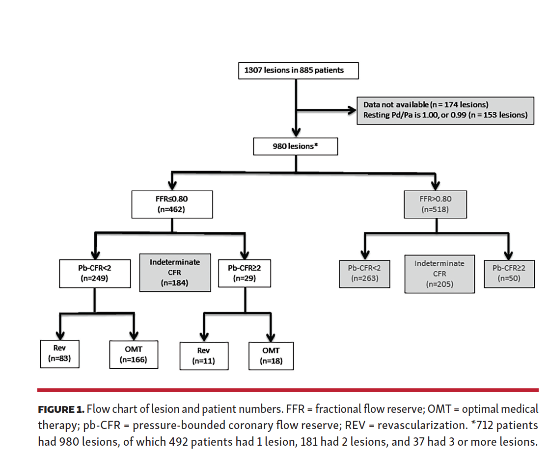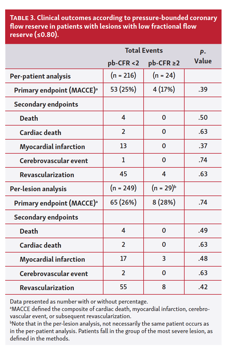 In a large, Korean, prospective registry of 2088 coronary lesions, including 288 treated medically with simultaneous FFR and pb-CFR measurement, no incremental utility of pb-CFR was found for clinical events when added to FFR.7 Although it is unclear why FFR-positive lesions were deferred in this observational registry, the results are comparable to the current analysis.