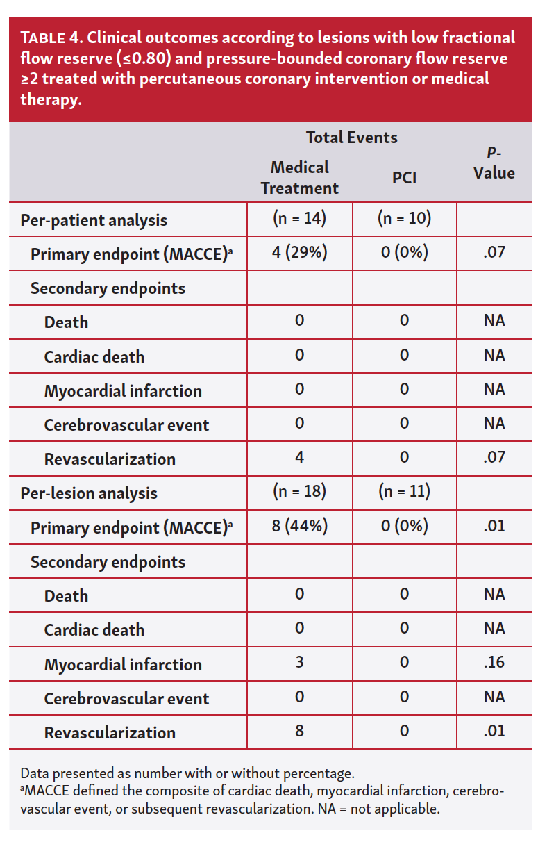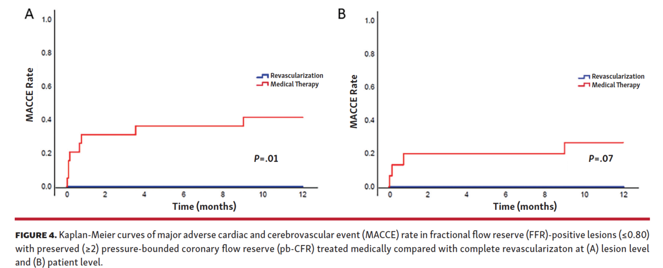 Interestingly, as depicted in Table 4, in the per-patient analysis, there is a non-significant but larger number of clinical events in the medically treated group compared with the PCI group (29% vs 0%, respectively; P=.07). Notably, 3 spontaneous myocardial infarctions occurred in lesions with FFR ≤0.80 but pb-CFR ≥2 when treated medically, compared with 0 corresponding events when treated with PCI. In addition, using a per-lesion analysis, MACCE occurred significantly more often in the medically treated group than in the PCI group (44% vs 0%, respectively; P=.01). These findings are displayed in the Kaplan-Meier curves in Figure 4.