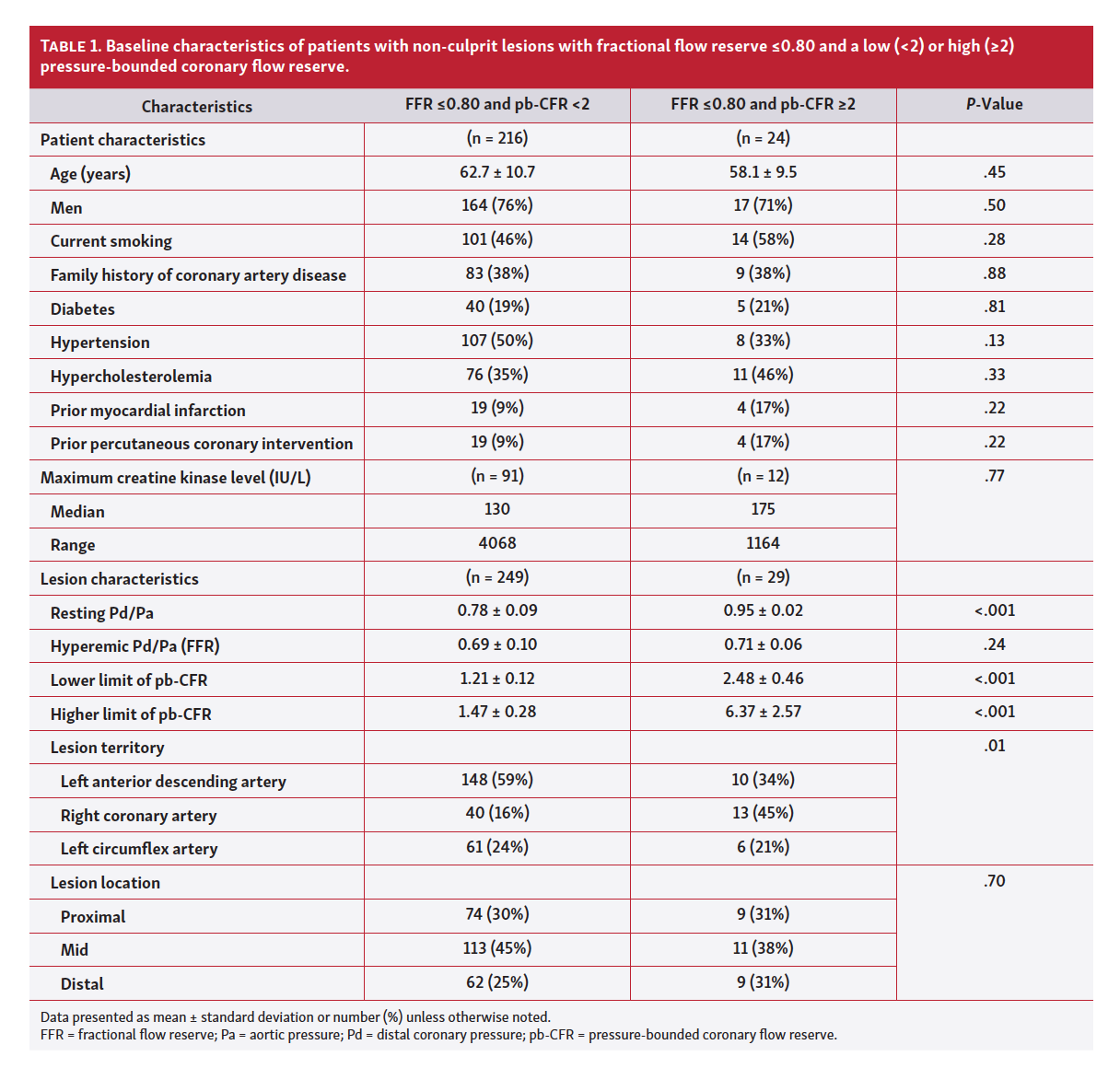 FFR and pb-CFR. As shown in the study flow chart (Figure 1), a total of 1307 lesions in 885 patients were identified. After excluding lesions with missing FFR or Pd/Pa values, or almost-normal Pd/Pa values of 0.99 or 1.00, a total of 980 lesions were included in the current analysis, of which 462 had an FFR ≤0.80. Of these, 249 lesions had pb-CFR <2, 29 lesions had pb-CFR ≥2, and 184 lesions had an indeterminate pb-CFR. Table 1 compares baseline characteristics between low CFR (<2) and intact CFR (≥2) in the group with low FFR (≤0.80). As expected physiologically, patients with low CFR had significantly lower resting Pd/Pa compared to patients with intact CFR. There were no other statistically significant differences in baseline characteristics between the low and intact pb-CFR arms in patients with FFR ≤0.80.