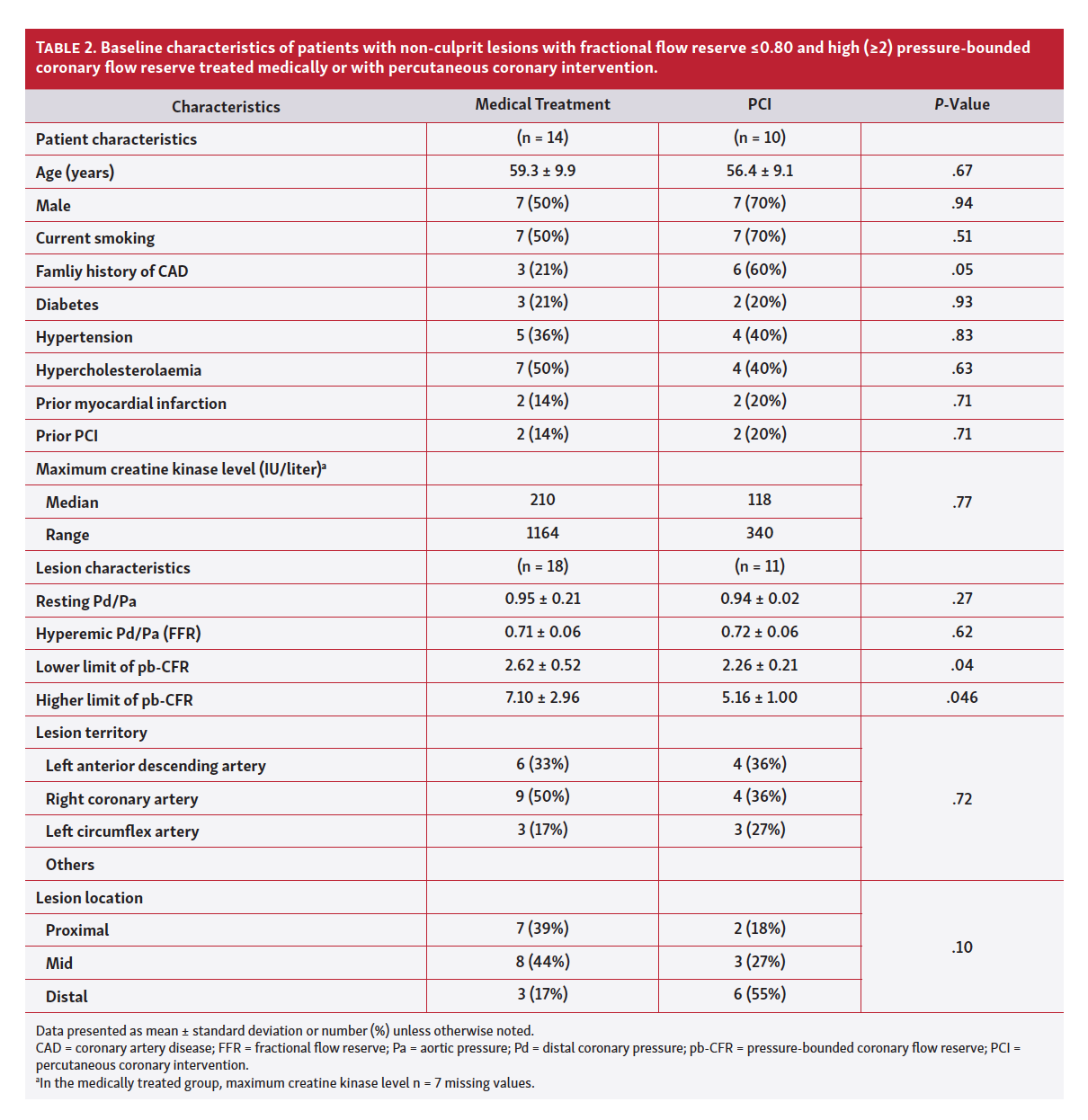 Positive FFR and preserved pb-CFR in patients treated medically vs complete revascularization. The flow chart (Figure 1) details the 462 positive FFR lesions, of which 29 had pb-CFR >2; of these lesions, 11 were treated with PCI and 18 were treated with optimal medical therapy. Table 2 compares baseline characteristics between medically treated patients and those who underwent PCI with positive FFR (≤0.80) but with preserved pb-CFR (≥2). As expected, due to randomization of treatment assignment, characteristics were similar for both groups.