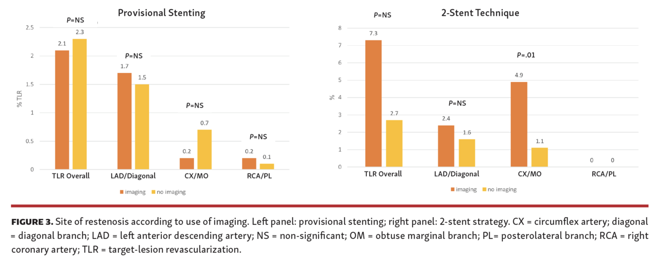 Finally, only 29% of patients underwent an IVUS/OCT-optimized procedure, with no significant benefit with regard to TLR rate at follow-up, even after stratifying the population according to the stenting strategy. The long-term impact of IVUS-guided non-LM bifurcation stenting was first assessed by Kim et al in 1668 patients undergoing DES implantation with or without IVUS guidance.28 IVUS-guided bifurcation stenting significantly reduced 4-year mortality compared with conventional angiography-guided stenting. In addition, IVUS guidance reduced the development of very late ST in patients receiving DES.27 Chen et al analyzed the difference in 1-year outcomes following 2-stent techniques involving implantation of DES for coronary bifurcation lesions between IVUS-guided and angiography-guided groups.29 Late ST at 12-month follow-up was 0% in the IVUS-guided group vs 4.9% in the angiography-guided group (P=.03), resulting in significant differences in ST-segment elevation MI between the 2 groups (2.4% vs 9.8%; P=.03). Of note, in both studies, the incidence of TLR at follow-up did not significantly differ among the subgroups of IVUS- or angiography-guided procedures. The recently published ULTIMATE trial,30 by Zhang et al, showed a net benefit of IVUS-guided DES implantation compared with angiography guidance in an all-comers population (9% of LM lesions, 25% coronary bifurcations) in terms of clinically driven TLR and definite ST (0.9% vs 2.3%; P=.02). Interestingly, this striking superiority observed at lesion-level analysis was not confirmed at patient-level analysis. Moreover, subgroup analysis showed that patients mostly had benefit from IVUS-guided PCI when treated on LM/left anterior descending lesions rather than on other vessels. In view of the low proportion of imaging-guided interventions among our cohort, we emphasize that no definitive conclusions can be drawn from our results and that further studies are warranted to evaluate the relevance of IVUS and OCT in patients treated with thin-strut DES implantation in bifurcation lesions and to definitely assess the impact of such ancillary techniques on clinical outcome.
