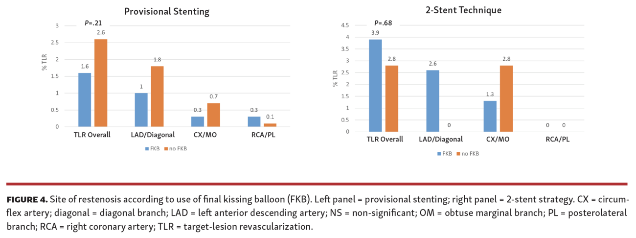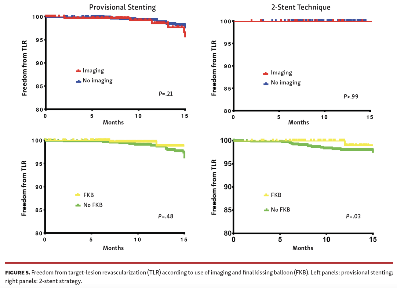 Our results also confirm currently available evidence about optimization with FKB. Although FKB was not associated with lower TLR in the overall cohort, we found FKB to reduce TLR at follow-up among patients treated with 2-stent technique, but not in those treated with provisional stenting. The issue of whether simultaneous balloon dilations of both main vessel and sidebranch should be performed after stent deployment in the main vessel was first addressed in the Nordic-Baltic Bifurcation Study III.26 In this trial, 477 patients with either stable or unstable disease and a bifurcation lesion were randomly assigned to either FKB or no FKB after stenting of the main vessel. At 6 months, there was no significant difference in the rate of the primary composite endpoint between the FKB and no FKB groups (2.1% vs 2.5%, respectively). This result is also in line with a previous finding of our group referring to the entire RAIN cohort.27