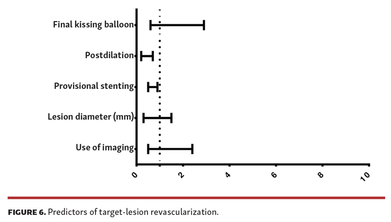 Predictors of TLR. At univariate analysis, admission diagnosis (ACS vs stable CAD; P=.20) and stenting strategy (provisional vs 2-stent technique; P=.50) were not significantly associated with TLR. Similarly, the proportions of patients treated with FKB and with intracoronary imaging support were not significantly lower among the TLR group. On the other hand, postdilation of the treated vessel was associated with the primary endpoint and a significant correlation was observed between the mean diameter of the main branch, the lesion length of the sidebranch, and the incidence of TLR, as stated above. After controlling in a multivariable model for FKB, stenting strategy, use of intracoronary imaging, diameter of lesions, and postdilation, only postdilation (HR, 0.32; 95% CI, 0.15-0.71; P<.01) and provisional stenting vs 2-stent strategy (HR, 0.62; 95% CI, 0.55-0.89; P=.03) were significantly associated with lower TLR rates in the overall population (Figure 6 and Table S3).