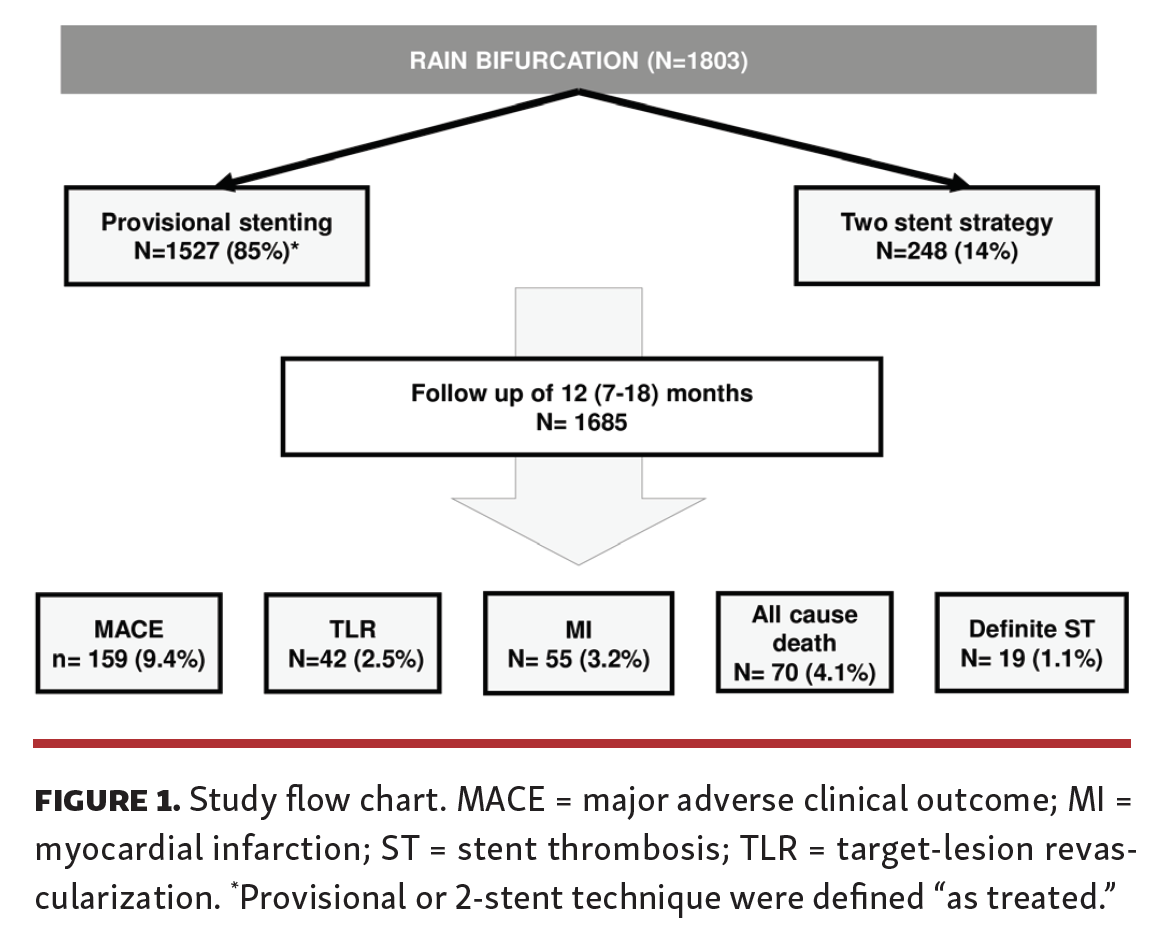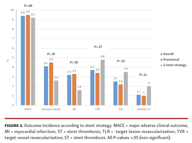 Endpoints. TLR rate, defined as critical restenosis (angiographic or with imaging or with functional evaluation according to operator’s choice) was the primary endpoint. MACE, a composite endpoint of all-cause death; myocardial infarction (MI) excluding periprocedural MI; TLR; and definite ST according to the definition by the Academic Research Consortium;16 and its single components, along with target-vessel revascularization, were the secondary endpoints. Outcomes were appraised according to stenting strategy (provisional vs 2-stent), use of FKB, and use of imaging.
