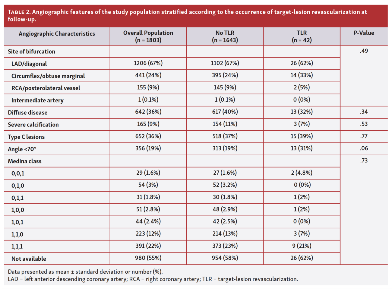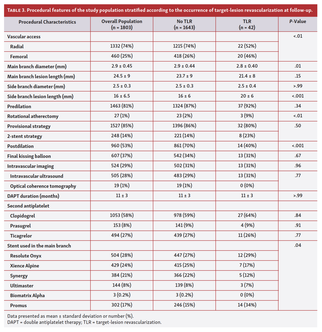 Clinical outcomes. Follow-up was available for 1685 patients (93%). The study flow chart is shown in Figure 1. The median follow-up was 12 months (IQR, 7-18), with a global TLR rate of 2.5% (42 patients). Patients with TLR had a mean age of 66 ± 10 years and no significant differences among baseline features were identified between this subpopulation and patients without TLR, except for a higher incidence of previous coronary artery bypass grafting in the former. Mean vessel diameter of the main branch was significantly lower in patients with TLR (2.9 ± 0.44 mm vs 2.8 ± 0.40; P=.01). On the other hand, patients experiencing TLR had longer lesions on the sidebranch (16 ± 6 mm vs 20 ± 6 mm; P<.001).