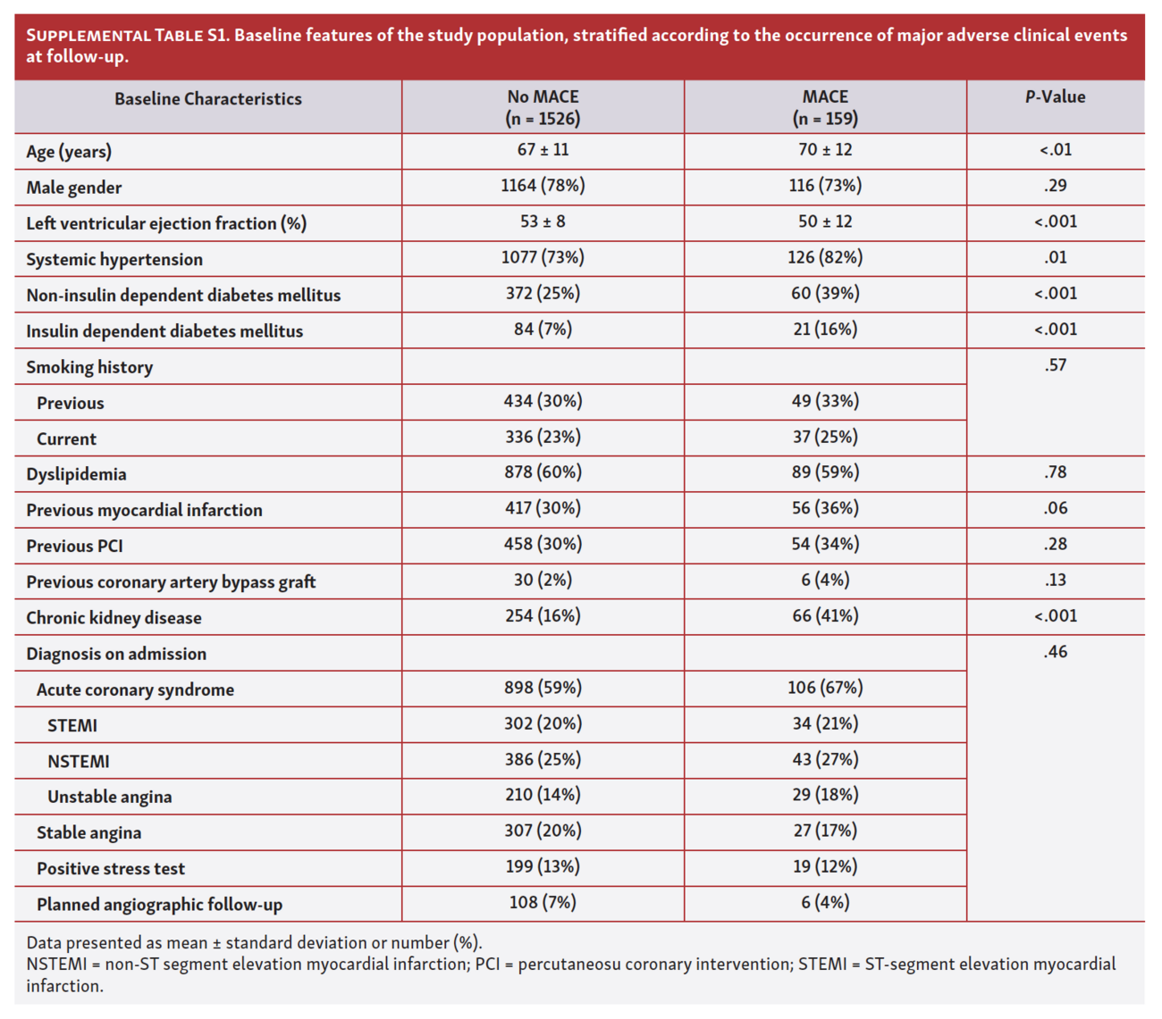 The global MACE rate was 9.4% (n = 159 patients). Among these, 70 patients (4.1%) died and 55 (3.2%) experienced an MI during follow up. Sixty-two patients (3.7%) underwent TVR. ST occurred in 22 patients (1.3%) during follow-up (19 definite, 1 probable, and 2 possible STs). Detailed information regarding MACE are reported in Supplemental Table S1, Supplemental Table S2, and Supplemental Table S3. Patients with MACE were significantly older, had a higher burden of cardiovascular risk factors, and had a lower ejection fraction compared with the remaining population. Among procedural strategies, radial access and postdilation were less frequently used in patients experiencing MACE at follow-up.