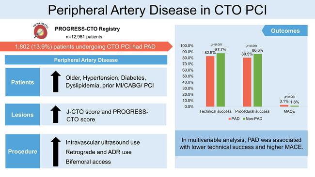 Methods. We analyzed the association of PAD with CTO-PCI outcomes using data from the PROGRESS-CTO registry of procedures performed at 47 centers between 2012 and 2023.