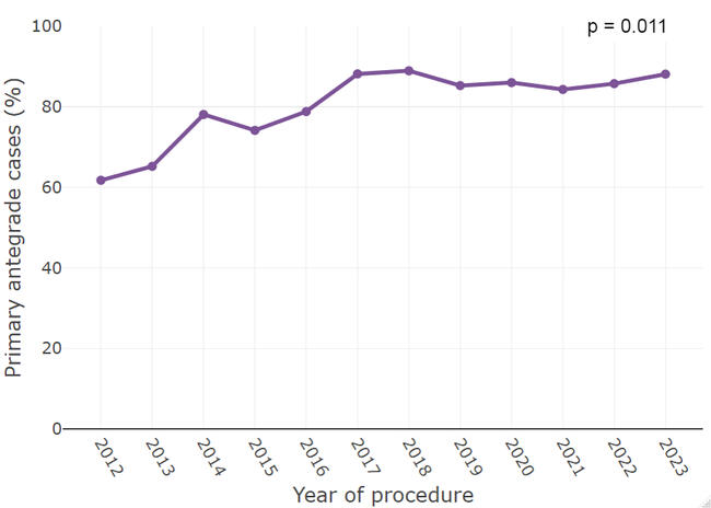 Antegrade wiring remains the most commonly used crossing strategy in CTO PCI.1 A primary antegrade wiring strategy was used in the majority (83.6%) of our cases, which is similar to the Europe-based RECHARGE (REgistry of Crossboss and Hybrid procedures in FrAnce, the NetheRlands, BelGium and UnitEd Kingdom) registry (77%)4 and the Asia-based Japanese CTO-PCI expert registry (74.2%),2 but higher than the US-based OPEN-CTO (Outcomes, Patient Health Status, and Efficiency in Chronic Total Occlusion Hybrid Procedures) registry (54.7%).3 In our registry, the use of primary antegrade wiring has been increasing over time, with 61.2% of 2012 cases using primary antegrade wiring, compared with 88.1% of 2023 cases.