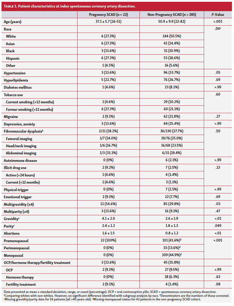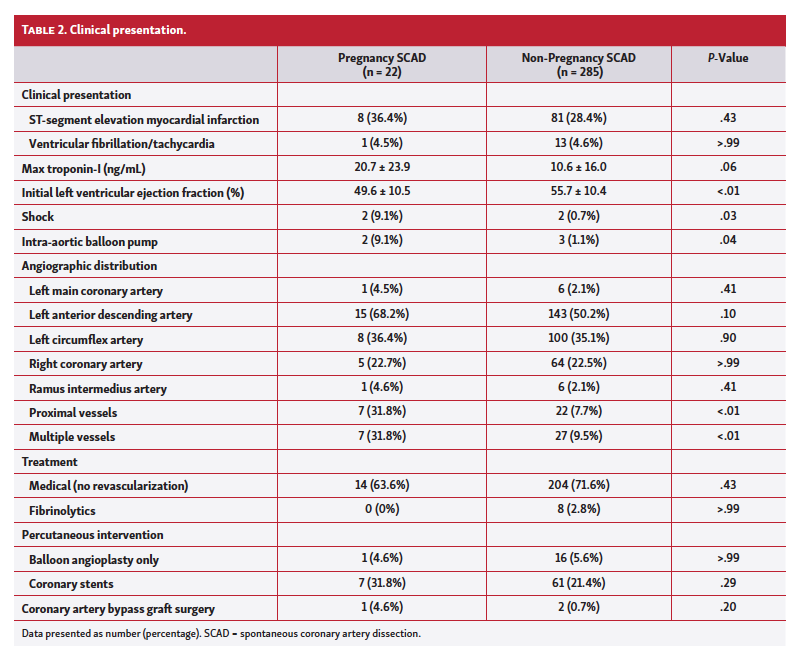 Spontaneous coronary artery dissection (SCAD) accounts for only 0.5% of hospitalizations for acute coronary syndrome, but it is a common cause of pregnancy-associated myocardial infarction, potentially accounting for 43% of acute coronary syndrome presentations in this population.1,2 SCAD results from vaso vasorum rupture and intramural hematoma development with coronary dissection, a pathology distinct from atherosclerotic plaque rupture and thrombosis, which account for most cases of acute coronary syndrome. Hormonal influences are postulated to increase SCAD risk; hence, pregnancy, breastfeeding, multiparity, and exogenous hormones have been identified as risk factors.3-5 Although pregnancy-associated SCAD (P-SCAD) accounts for a relatively low percentage of SCAD cases, it is associated with higher-risk presentations and worse outcomes, including more left main and multivessel involvement, cardiogenic shock, urgent percutaneous intervention (PCI), or coronary artery bypass surgery (CABG), and higher mortality.6,7 Several case series of P-SCAD have been published, but the limited data available may be influenced by ascertainment and referral bias.6,7 Therefore, P-SCAD was identified as a research priority in a recent scientific statement on SCAD from the American Heart Association.6 This study identified all SCAD patients in a large community-based practice and compared the clinical course and long-term outcomes of P-SCAD with non-pregnancy SCAD (NP-SCAD).