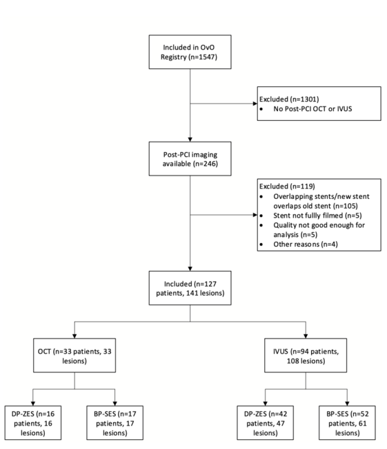 The present intravascular imaging analysis included all patients who underwent post-PCI intravascular imaging with either IVUS or OCT. Multiple vessels per patient could be included and inclusion of multiple lesions per vessel was allowed if treated with non-overlapping stents. Exclusion criteria included treatment of in-stent restenosis and inadequate quality of the IVUS or OCT pullback.