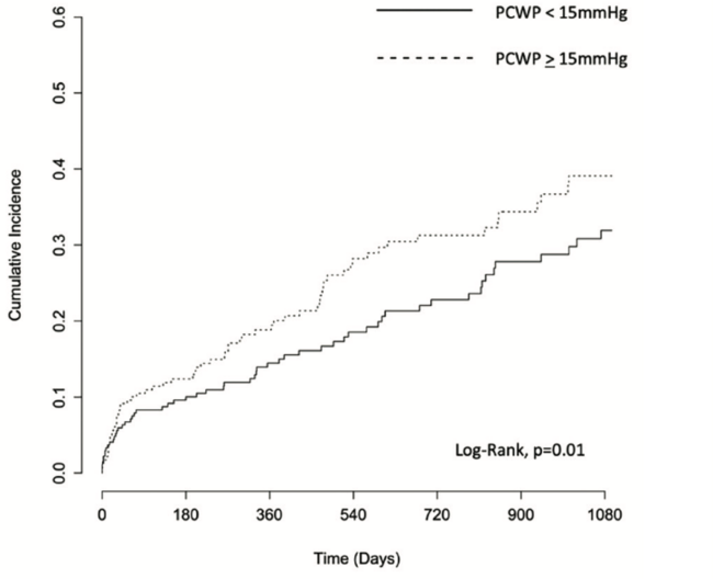 PCWP ≥15 mm Hg. There were 245 patients (47%) with PCWP ≥15 mm Hg. These patients were more likely to have a higher body mass index (27.2 kg/m2 vs 25.8 kg/m2), chronic obstructive pulmonary disease (42% vs 33.2%), atrial fibrillation/flutter (50.6% vs 28.9%), more beta-blocker use (66.9% vs 58.1%), higher brain natiuretic peptide (457.5 pg/mL vs 258 pg/mL), lower ejection fraction (60% vs 65%), and at least moderate mitral regurgitation (16.7% vs 8.9%) vs patients with PCWP <15 mm Hg, respectively (all P<.05). At long-term follow-up adjusting for age, sex, body mass index, peripheral vascular disease, atrial fibrillation/flutter, and glomerular filtration rate, PCWP ≥15 mm Hg was an independent predictor of the composite outcome of all-cause mortality and heart failure hospitalization (hazard ratio [HR], 1.48; 95% confidence interval [CI], 1.02-2.07; log rank P=.01 for time-to-event analysis) (Table 3 and Figure 1). When evaluating the outcomes separately, PCWP ≥15 mm Hg was independently associated with heart failure hospitalization (HR, 2.12; 95% CI, 1.21-3.40), but not all-cause mortality (HR, 1.36; 95% CI, 0.94-1.95) after TAVR. At 30-day and 1-year follow-up, PCWP ≥15 mm Hg was not associated with worse outcomes, ie, composite outcome (30 days: HR, 1.27; 95% CI, 0.60-2.69; 1 year: HR, 1.32; 95% CI, 0.83-2.10), all-cause mortality (30 days: HR, 1.54; 95% CI, 0.57-4.14; 1 year: HR, 1.40; 95% CI, 0.81-2.44), or heart failure hospitalization (30 days: HR, 1.03; 95% CI, 0.33-3.28; 1 year: HR, 1.69; 95% CI, 0.83-3.44) on multivariate analysis.