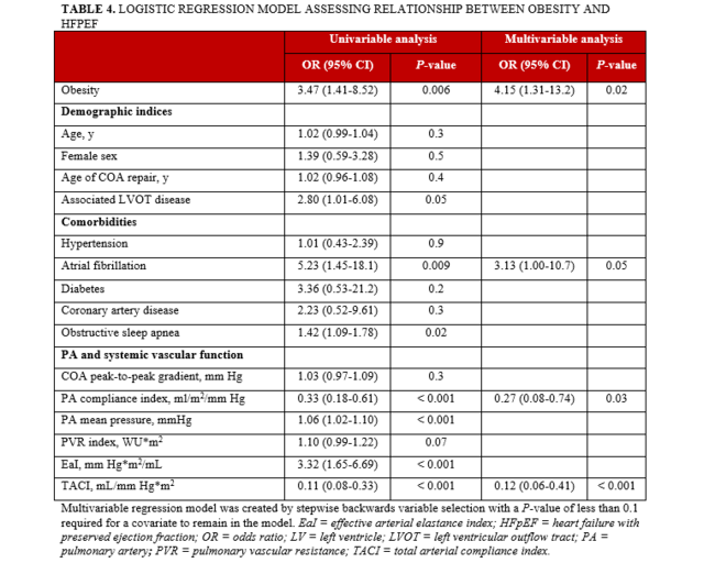 Conclusions. The abnormal hemodynamics and higher prevalence of HFpEF in COA patients with obesity underscores the need for intervention to address obesity in this population.