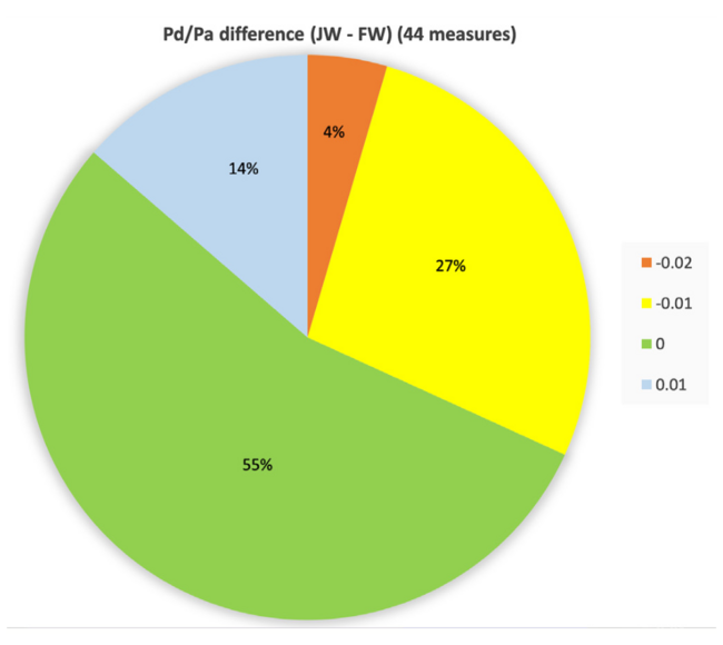 The similarity of the values from the JW and FW remained constant in a low range of Pd/Pa values (from 0.21 to 0.99) (Table 1 and Table 2). Considering the 44 comparisons made, in 55% of the measures FW and JW recorded the same value and a 0.01 difference was recorded in 41% of measures. A 0.02 difference was measured in 4% of cases (Supplemental Figure S1).