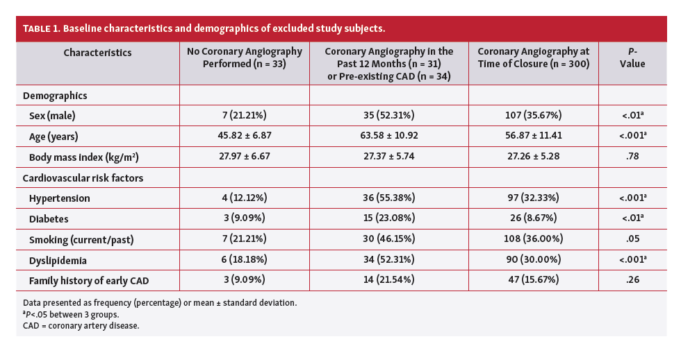 Study limitations. The main limitations of this study are its retrospective design and the use of medical records as source documents. To minimize errors typical to medical chart abstraction, we used standardized data collection by data abstractors and conducted audits and data cleaning. Another potential limitation is that data were collected from a single high-volume institution, which may limit the generalizability of our findings. Furthermore, this study relied heavily on coronary angiographic visual assessment. This technique is inherently subjective and difficult to standardize. We attempted to achieve consistent data collection from both evaluators by creating a standardized CAD data-collection form and by having up to 3 reviewers examine angiograms where there was a difference of opinion. We wanted our analysis to mirror real-world practice and did not carry out quantitative coronary angiographic analysis.