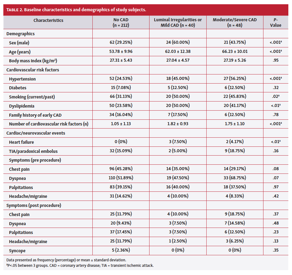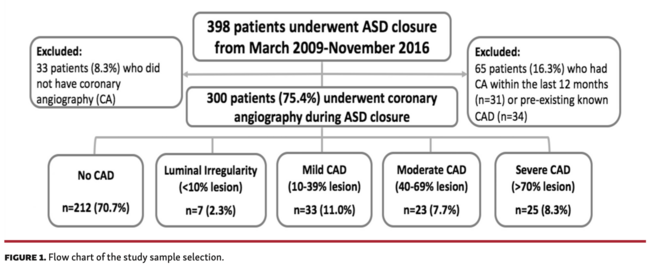 This single-center, retrospective study assessed outcomes of routine coronary angiography in adults >40 years old at the time of percutaneous ASD closure. Despite no significant symptomatic differences between groups based on CAD status, nearly 1 in 6 patients were found to have moderate to severe CAD that resulted in further management changes in addition to ASD closure in 36 patients (12.0%).