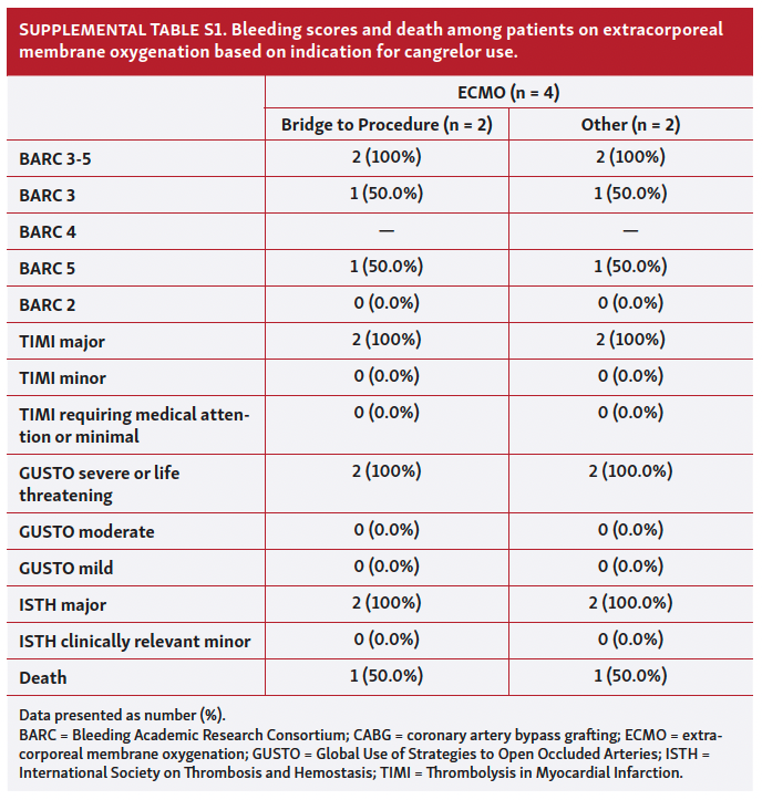 Prior studies investigating cangrelor use have reported significant variability of major bleeding rates. The CHAMPION PHOENIX studies examined cangrelor use in PCI; they found patients to be at a higher risk of non-significant bleeding events (eg, hematoma) than the placebo group with no difference in major bleeding, and noted significantly reduced ischemic events during PCI in patients receiving cangrelor compared with placebo.1-3 The BRIDGE trial prospectively examined 210 patients bridged with cangrelor infusion vs placebo prior to undergoing CABG surgery;4 notably, it found no significant difference in bleeding events between the cangrelor group and the placebo group, with approximately 10% of patients in both arms having bleeding events. Like most randomized controlled trials, BRIDGE enrolled a selected population, specifically excluding patients with GFR <30 mL/min; therefore, the applicability of these results to an all-comers population of patients treated with cangrelor as a bridging strategy is uncertain. Other studies have investigated cangrelor use in severely ill patients, primarily for those in cardiogenic shock, but not necessarily for the purpose of bridging. Vaduganathan et al found GUSTO mild or moderate bleeding in 11 of 38 patients (29%) with cardiogenic shock treated with cangrelor during the first 48 hours of infusion, but reported no major bleeding events.16 Droppa et al described 136 cardiogenic shock patients treated with cangrelor (± glycoprotein IIb/IIIa inhibitors) and found in-hospital GUSTO moderate and severe bleeding in 33 patients (24.6%); when 88 of these patients were matched to “control” patients from IABP-SHOCK II who did not receive cangrelor, patients treated with cangrelor did not exhibit statistically higher rates of GUSTO moderate or severe bleeding (21.6% in the cangrelor group vs 19.3% in the control group).17