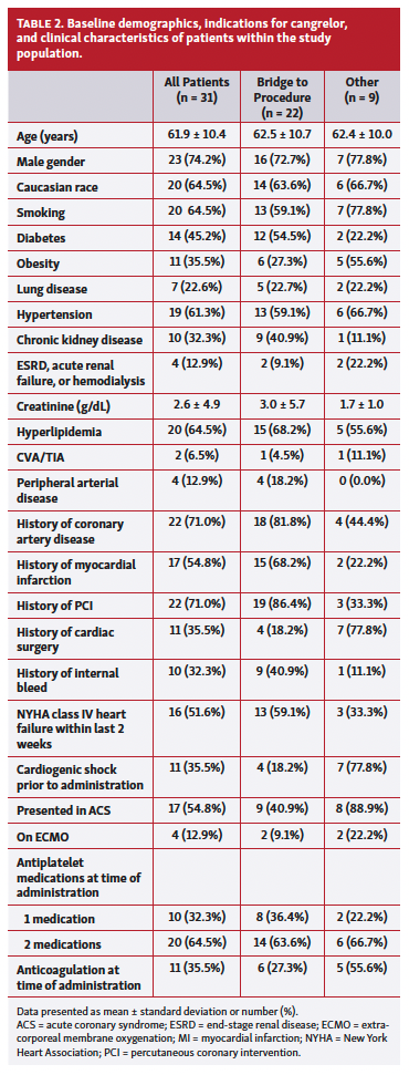 Between January 2017 and August 2020, a total of 31 inpatients received cangrelor for at least 1 hour outside of the cardiac catheterization laboratory and met the inclusion criteria for the presence of coronary or other arterial stents. Twenty-nine of 31 patients had coronary arterial stenting either during the current admission or within the previous 6 months, and the other 2 had presence of peripheral arterial stents in addition to coronary stents placed (>2 years prior). All patients were given cangrelor at a dose of 0.75 µg/kg/min consistent with the BRIDGE trial,4 with the exception of 1 patient who was initiated on 4 µg/kg/min during a complex PCI and was reduced to 0.75 µg/kg/min while strictly NPO after the procedure; there were no documented dosing errors. Oral P2Y12 inhibitors were generally discontinued 5 days prior to planned surgeries, although were often discontinued 1-2 days prior to surgery in urgent or emergent situations. Median duration of infusion was 70 hours (minimum, 8 hours; 25th percentile, 43.9 hours; 75th percentile, 96 hours; maximum, 630 hours). Of the 31 patients, 16 (51.6%) had New York Heart Association (NYHA) class IV heart failure within 2 weeks of presentation, 11 (35.5%) were in cardiogenic shock on admission, 17 (54.8%) presented with acute coronary syndrome (ACS), and 4 (12.9%) were on extracorporeal membrane oxygenation (ECMO) at the time of cangrelor administration. In terms of indication, 22 of 31 patients were given cangrelor as bridge to a surgical procedure (10 CABG surgeries, 9 non-CABG cardiac surgeries, and 3 non-cardiac surgeries) and 9 were given cangrelor due to being strict NPO or having no GI access, categorized as “other.” Of note, 2 of the 22 patients in the bridge to surgery group did not undergo surgery; 1 patient met both criteria of being bridged to procedure and being strict NPO so was classified as bridge to procedure for summary purposes, and 1 was given cangrelor for physician preference to avoid long-acting P2Y12 inhibitors due to a presumed high risk of bleeding, but required surgery and so was also classified as bridge to procedure. Table 2 displays baseline demographics, clinical characteristics, and indications for cangrelor of the patients included in the study.