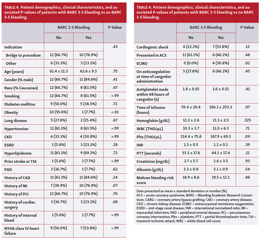 On univariable analyses, only ECMO was significantly associated with BARC 3-5 bleeding. Obesity was significantly associated with a lower incidence of bleeding. Time of cangrelor infusion (hours) trended toward significance. No other baseline demographic, historical, or clinical criteria were associated with the development of BARC 3-5 bleeding (Table 4).