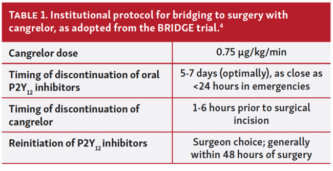 Cangrelor is a potent intravenous (non-thienopyridine) adenosine triphosphate analog that blocks the adenosine diphosphate P2Y12 receptor and has a short time to therapeutic onset and short half-life. In patients undergoing percutaneous coronary intervention (PCI), cangrelor has been shown to reduce the risk of periprocedural ischemic events and was therefore approved for use during PCI in patients who have not been treated with an oral P2Y12 inhibitor or a glycoprotein IIb/IIIa inhibitor.1-3 It has also been used for the off-label indication of antiplatelet bridging prior to surgery in patients felt to be at high risk for thrombotic complications, particularly in those who have had recent coronary stenting and are therefore at higher risk for subacute stent thrombosis. Such bridging is generally used prior to cardiac surgery when continued use of oral P2Y12 inhibitors with longer half-lives is contraindicated due to risk of bleeding during or shortly after surgery.4 More recently, it has been extrapolated for use in other perioperative cases as well.5