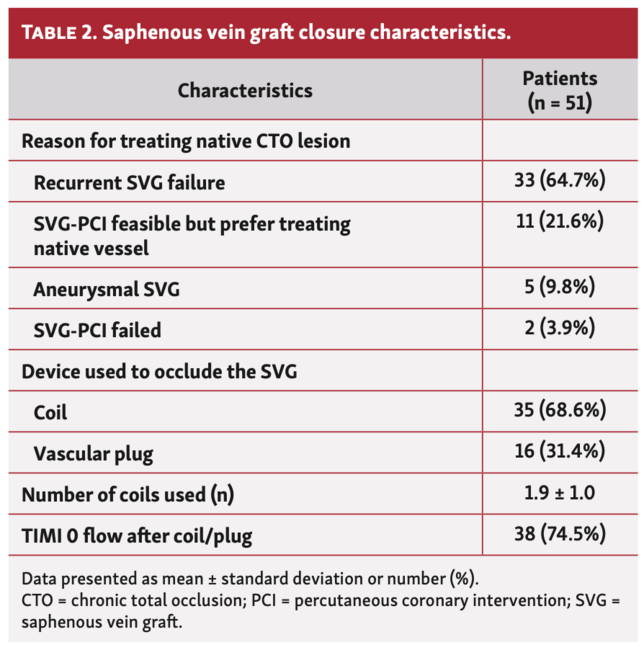 Wilson et al5 reported SVG occlusion following PCI of the native vessel in 33 patients with a high (97%) success rate (defined as TIMI 0 flow or TIMI ≤1 flow with complete resolution of competitive flow). In contrast to our study, in which coils were used more frequently than vascular plugs to intentionally occlude SVGs, vascular plugs (1 plug in 72.7% and 2 plugs in 24.2%) were used in all patients, with an additional neurovascular coil implanted in 1 patient.
