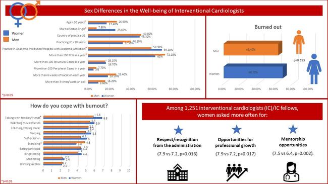 Several studies suggest differences in burnout and coping mechanisms between female and male physicians.1-3 We conducted an international, anonymous, online survey exploring sex-based differences in the well-being of interventional cardiologists.