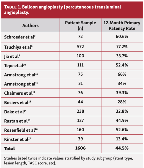 15. Rastan A, Krankenberg H, Baumgartner I, et al. Stent placement versus balloon angioplasty for the treatment of obstructive lesions of the popliteal artery: a prospective, multicenter, randomized trial. Circulation. 2013;127(25):2535-2541. doi:10.1161/CIRCULATIONAHA.113.001849