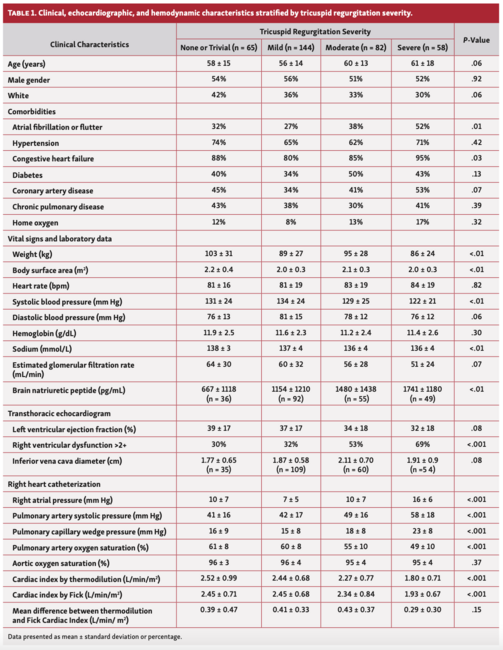 Study limitations. Our study has limitations, including its retrospective design at a single institution. The severity of TR documented on transthoracic echocardiogram could have changed prior to right heart catheterization with changes in volume status or initiation of guideline directed medical therapy for heart failure.