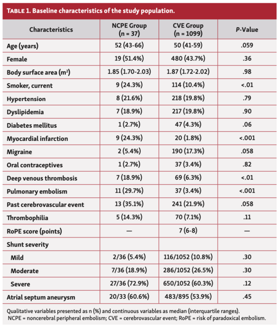 Baseline characteristics. The main baseline characteristics of the study population are shown in Table 1. Peripheral embolism patients tended to be older (52 years [IQR, 43-66] vs 50 years [IQR, 41-59]; P=.059), exhibited more frequently a history of ischemic events (prior to the event leading to PFO closure) including MI (24.3% vs 1.8%; P<.001) and stroke (35.14% vs 21.93%; P=.058), and had more frequently a diagnosis of concomitant or prior DVT (18.9% vs 6.2%; P<.01) and pulmonary embolism (29.7% vs 3.3%; P<.001). Also, a tendency toward a higher rate of thrombophilic disorders was observed in the NCPE group (14.3% vs 7.1% in the CVE group; P =.11). There were no differences between groups in baseline echocardiographic characteristics.